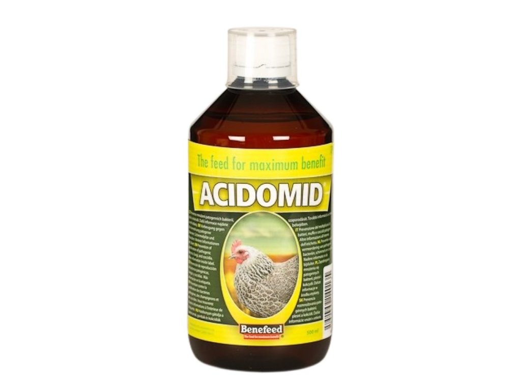 ACIDOMID® je špičkový výrobek moderní koncepce působící nejen proti množení patogenních bakterií, ale velice dobře také tlumí rozvoj a množení nitrobuněčných parazitů jako např. kokcidií. ACIDOMID® však není léčivo, neobsahuje ani kokcidiostatika a nezanechává tak rezidua v organismu. Nemá také ochranné lhůty.ACIDOMID® obsahuje kompletně všechny organické kyseliny důležité pro zažívání a trávení. Organické kyseliny okyselují napájecí vodu, účinně ji také konzervují a stabilizují. Je tak výrazně omezováno nežádoucí množení patogenních bakterií a plísní v napájecí vodě, napáječkách a v rozvodech napájecí vody. Organické kyseliny jsou lehce stravitelné, v organismu jsou navíc využitelné jako zdroj energie. Organické kyseliny také redukují potíže zažívacího traktu a zlepšují stravitelnost bílkovin.ACIDOMID® díky látkám přírodního charakteru snižuje množení nitrobuněčných parazitů, jako jsou například kokcidie. Pro maximální efekt je však třeba pravidelného podávání do napájecí vody kdykoli ji měníte. ACIDOMID® jako jediný přípravek svého druhu na trhu obsahuje vyvážený poměr elektrolytických prvků podporujících účinnost jednotlivých aktivních složek výrobku. Elektrolyty urychlují a zvyšují přechod účinných látek přes buněční membránu do nitra buňky.Složení: minerální látky, elektrolyty organické kyseliny (mravenčí, propionová, mléčná, octová, citronová a další) vitamín C extrakty přírodního původu upravená pitná voda Krmný návod:podává se v množství 10 ml na 1 litr napájecí vody po celý rok. První 2-3 dny v počátku podávání přípravku se doporučuje dávkování poloviční (0,5% tzn. 5 ml na 1 litr napájecí vody).Doplňkové parametry