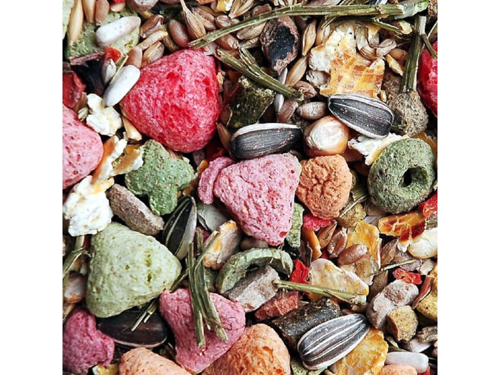 Výběrové krmivo pro všechny druhy hlodavců. Doplněné o rozmanité, křupavé, extrudované obiloviny.Složení: ložení: vojtěška sušená /LUCERNE/, vločky kukuřičné, vločky hrachové, svatojánský chléb, oves, pšenice, ječmen, granule voltěškové - velké, slunečnice žíhaná - drobnozrnná, slunečnice černá, vločky fazolové, mrkev sušená, slunečnice bílá- česká, kukuřice, EX Green Rolls, EX křížky mix barev, EX kroužky mix barev, EX trojůhelníky mix barev, EX jahůdky, EX mixDoplňkové parametry