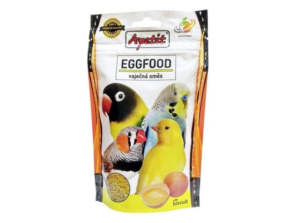 Doplňkové krmivo pro výbornou, trvalou kondici ptáků. Vaječnou směs ptáci dobře přijímají a rychle tráví. Obsahuje potřebné složky pro správný růst mladých ptáků, pro zvýšené nároky dospělých ptáků v období rozmnožování a také v období přepeřování.Krmný návod: vaječnou směs je vhodné používat v průběhu celého roku pro dlouhodobou dobrou kondici ptáků, především však v obdobích větších nároků na výživu, jako je přepeřování, rozmnožování a odchov mláďat. Vaječná směs Apetit EGGFOOD je vhodná pro zebřičky, kanáry, andulky, korely, agapornise a všechny další druhy semenožravých ptáků. Přidávejte do krmiva celoročně 3x týdně v množství 25% denní dávky krmiva. Během přepeřování a rozmnožování podávejte v množství 25% denní krmné dávky každý den. Ujistěte se, že má váš pták vždy k dispozici čerstvou vodu. Vaječná směs je připravená k přímému použití. Znehodnocené krmivo z klece likvidujte.Složení: pekařské výrobky, vejce a výrobky z vajec, vedlejší rostlinné produkty, oleje a tuky, cukry, semena, vaječné žloutky, mléko a mléčné deriváty, barvivo, aroma, antioxidant. Deklarované jakostní znaky: vlhkost do 10 %.Doplňkové parametry