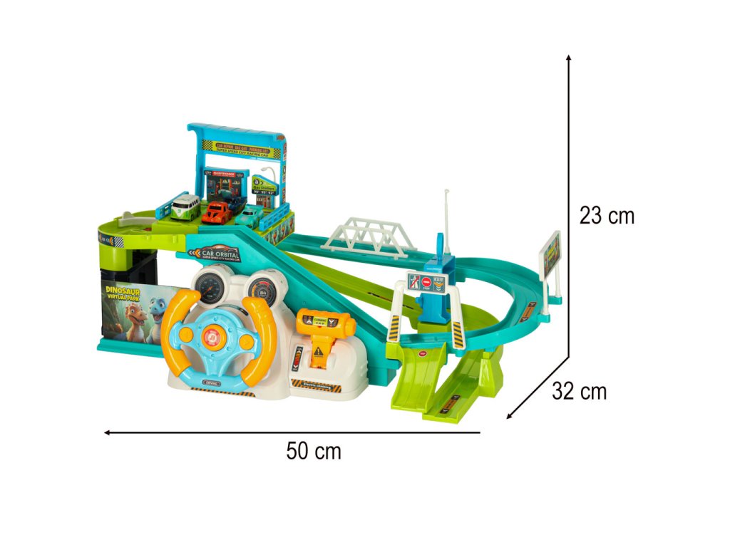 Autodráha je plná zatáček a kopců, po kterých budou jezdit čtyři autíčka. Aby autíčka snadno dojela na vrchol dráhy, je třeba aktivovat výtah, který lze ovládat ručně otáčením kolečka, nebo automaticky připojením volantu a zatažením za řídítka. Volant je vybaven třemi tlačítky pro aktivaci zvukových efektů, díky nimž je zábava ještě zajímavější.