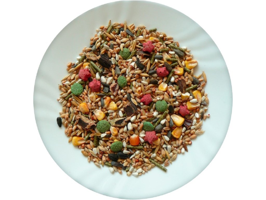 Složení: kukuřice, pšenice, ječmen, kardi, slunečnice černá, slunečnice žíhaná, oves celý, úsušky pícnin, extrudované obiloviny.K doplnění plné hodnoty krmiva podávejte čerstvé ovoce, kořenovou zeleninu, aj. Denně zajistěte dostatek pitné vody.Doplňkové parametry