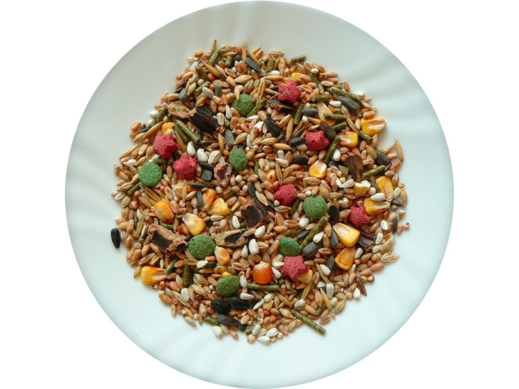 Krmný návod: Krmte dle potřeby. Zajistěte dostatek pitné vody.Složení: pšenice, ječmen, vojtěška, kukuřice, oves, čirok, safrol, slunečnice, extrudovaná pšenice a kukuřice, svatojánský chléb.Analytické složky: hrubý protein 12,2%, hrubá vláknina 8,3%, hrubé oleje a tuky 6%.Doplňkové parametry