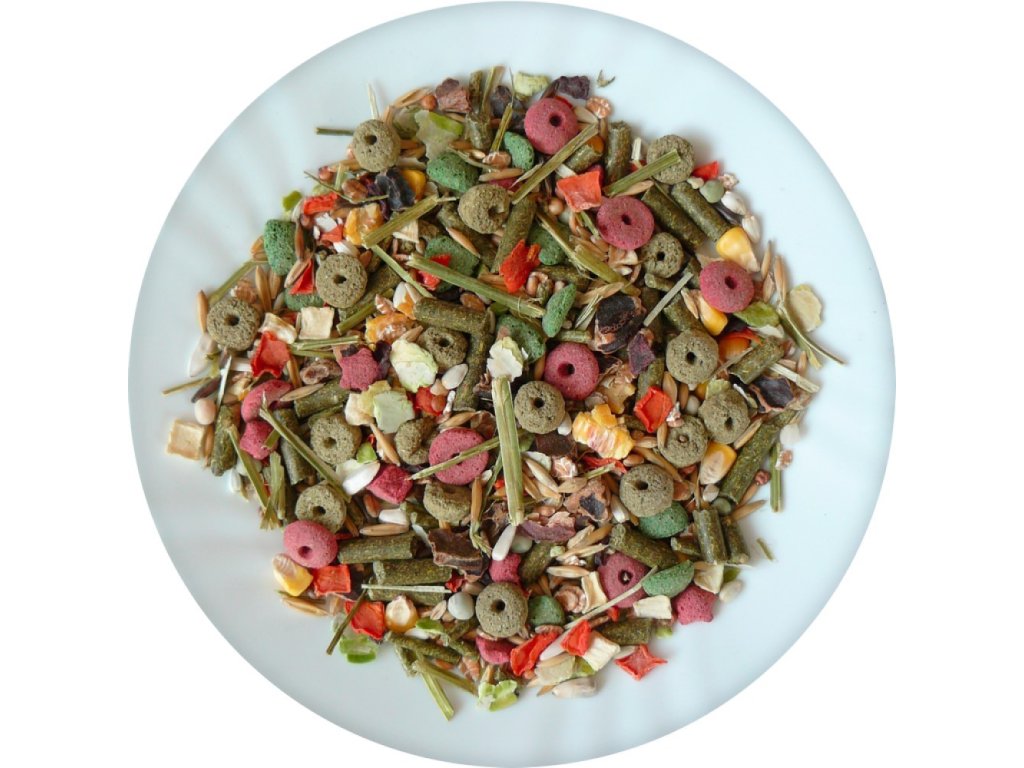 Složení: vojtěška, extrudovaná pšenice a kukuřice, oves, hrachové vločky, rohovník obecný, ječmen, pšeničné vločky, kukuřičné vločky, extrudovaná vojtěška, safrol, sušená mrkev, hrách, pšenice, kukuřice, pastyňák, čirok, slunečnice.Analytické složky: hrubý protein 13,3%, hrubá vláknina 15,5%, hrubé oleje a tuky 3,7%.Denně zajistěte dostatek pitné vody.Doplňkové parametry