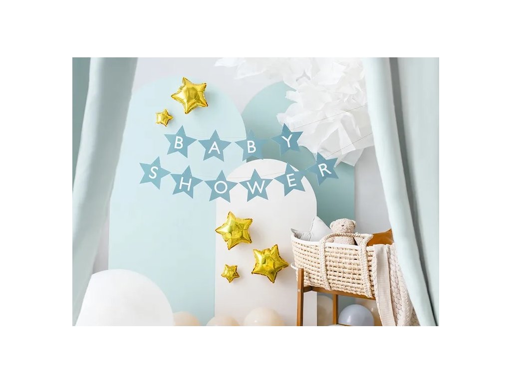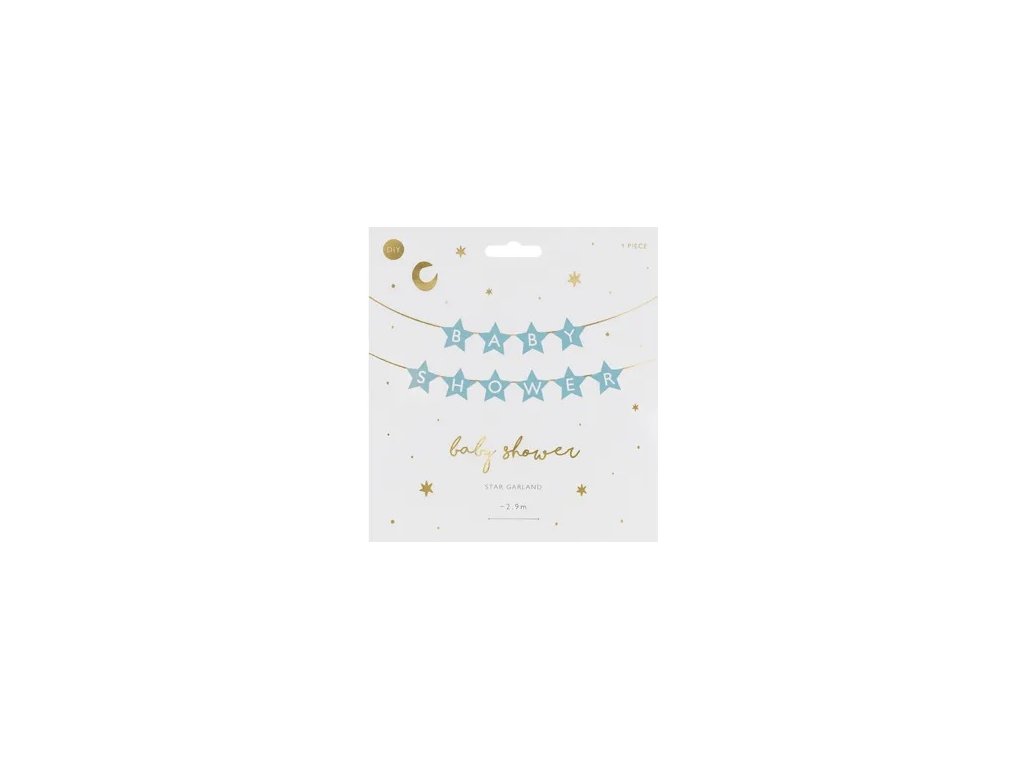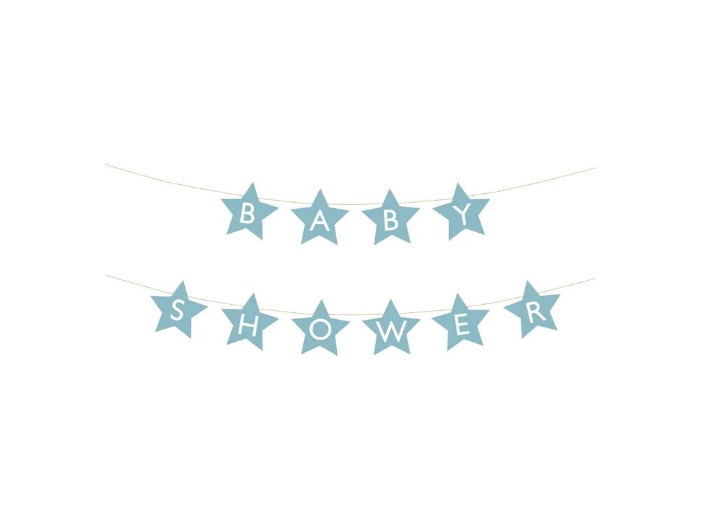 Transparent ve tvaru hvězdy s nápisem Baby Shower z papíru ve světle modré barvě, rozměry provázku cca 3 m.
