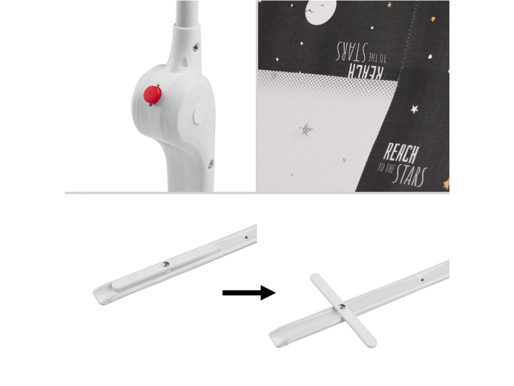 Když zábradlí nepotřebujete, můžete ho snadno sklopit pomocí tlačítek na bocích, takže nevyčnívá nad úroveň matrace. Robustní konstrukce kombinuje odolný kov s pevným plastem, aby byla zajištěna stabilita každou noc. Díky tomu zábrana nejen chrání vaše dítě, ale vydrží i vyšší zátěž. Klidný spánek bez obav - pro vás i vaše děťátko!