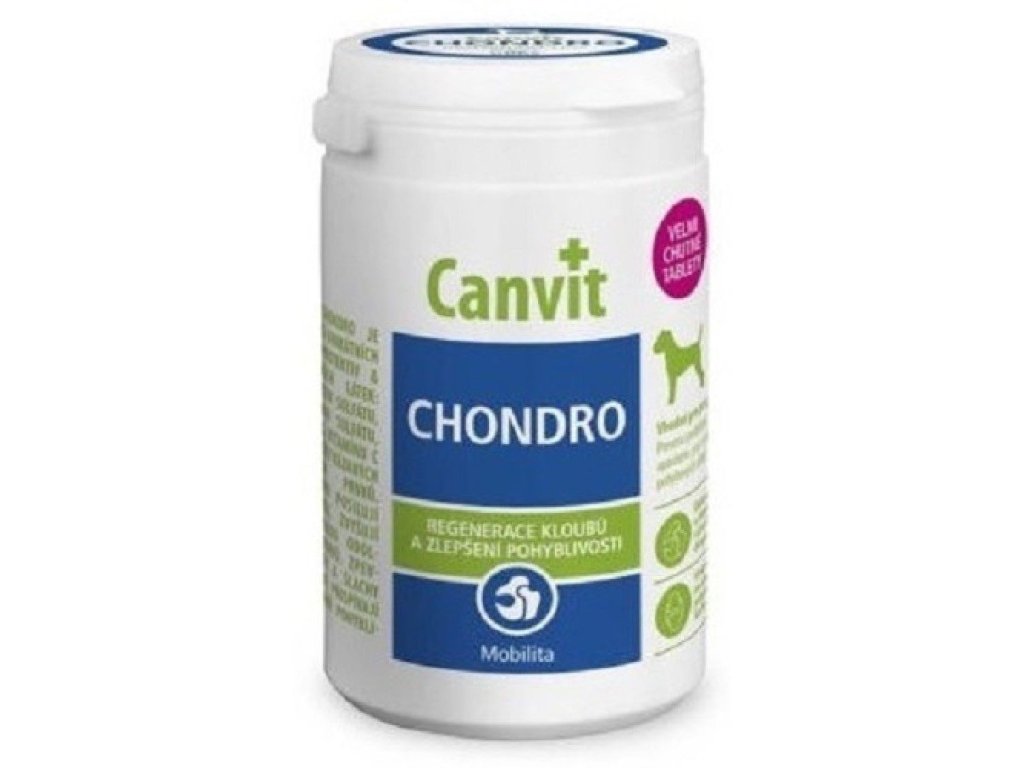Vhodné pro psy do 25 kg, pro prevenci problémů s pohybovým aparátem, psy s vyšším rizikem pohybových obtíží.Canvit CHondro je kombinací unikátních chondroprotektiv & bioaktívních látek: chondroitin sulfátu, glukosamin sulfátu, kolagenu, vitamínu C a organicky vázaných stopových prvků. Tyto látky posilují chrupavku, zvyšují mechanickou odolnost kloubů, zpevňují vazy a šlachy a celkově přispívají ke zlepšení pohyblivosti.Složení: sušená laktóza, kolagenní hydrolyzát 10 %, sušené pivovarské kvasnice, pšeničný škrob, glukosamin sulfát 7,0 %, chondroitin sulfát 4,2 %, hydrogenfosforečnan vápenatý, drůbeží moučka, chelát hořčíku 0,17 %, oxid hořečnatý.Analytické složky: Hrubý protein 20,5 %, obsah tuku 2 %, hrubá vláknina 7 %, hrubý popel 15 %, hořčík 0,35 %.Doplňkové látky v 1 kg: Nutriční: Vitamín E (-tokoferol acetát) (3a700) (3a700) 3 500 mg, vitamín C (E300) 7 000 mg, Biotin 100 mg, Niacinamid (3a315) 1 500 mg, Mangan (E5, chelát manganu a aminokyselin n-hydrát) 260 mg, Selen (3b8.11, organický selen ze Saccharomyces cerevisiae NCYC R397) 2 mg. Obsahuje antioxidanty.Doporučené denní dávkování: na 5 kg hmotnosti psa Mladí, rostoucí psi / 1 tabletaRegenerace chrupavek, psi v zátěži a starší psi / 2-3 tabletyDoplňkové parametry