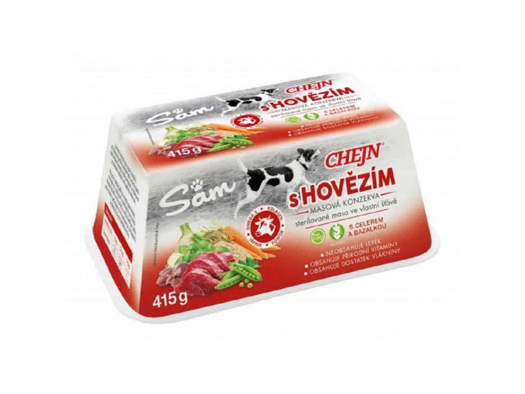 Kvalitní maso a vnitřnosti zaručují přirozený obsah kolagenu a mastných kyselin. Celer podpoří lepší trávení, zdravou kůži a oči. Bazalka povzbudí činnost ledvin a uklidňuje. Krmivo je možno podávat samostatně jako kompletní krmnou dávku, nebo jako doplněk v kombinaci s oblíbenou přílohou, např. s těstovinou, rýží nebo s granulemi.Složení: maso a výrobky živočišného původu 95% hovězí maso, masový ořez, kuřecí, chrupavčité tkáně, kuřecí krky, vnitřnosti (srdce, ledvinky, dršťky, plíce, játra), rýže, mrkev, celer, hrách, želírovací látky, bazalka.Deklarované jakostní znaky: bílkoviny 11,7 %, obsah tuku 4,5 %, hrubá vláknina 1,6 %, hrubý popel 1,6%, vlhkost 77,6 %, vápník 0,9 %, fosfor 0,65 %, sodík 0,21 %, hořčík 0,04 %.Krmivo neobsahuje lepek, sóju, geneticky modifikované suroviny, ani barviva. Dávkování:hmotmost psa 1 - 3kg 3-5kg 7 - 9kgdenní dávka 1/2 3/4 1Doplňkové parametry