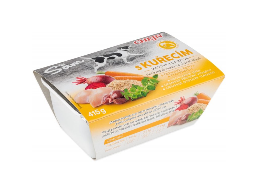 Oblíbená masová konzerva pro psy. Kvalitní maso a vnitřnosti zaručují přirozený obsah kolagenu a mastných kyselin. Červená řepa dodá vitalitu a posílí organismus, dobromysl zaručí lepší trávení a dobrou náladu. Krmivo je možno podávat samostatně jako kompletní krmnou dávku, nebo jako doplněk v kombinaci s oblíbenou přílohou, např. s těstovinou, rýží nebo s granulemi. Složení: maso a výrobky živočišného původu, mleté kuře, krky, žaludky,, srdce, játra, mrkev, rýže, želírovací látky, červená řepa, dobromysl, Deklarované jakostní znaky: bílkoviny 11 %, tuk 4,2 %, vláknina 0,5 %, hrubý popel 1,5%, vlhkost 78,8 %, vápník 1,19 %, fosfor 0,64 %, sodík 0,22 %, hořčík 0,041 %, draslík 0,2 %. Krmivo neobsahuje lepek, sóju, geneticky modifikované suroviny, ani barviva. Dávkování:hmotmost psa 1 - 3kg 3-5kg 7 - 9kgdenní dávka 1/2 3/4 1Doplňkové parametry