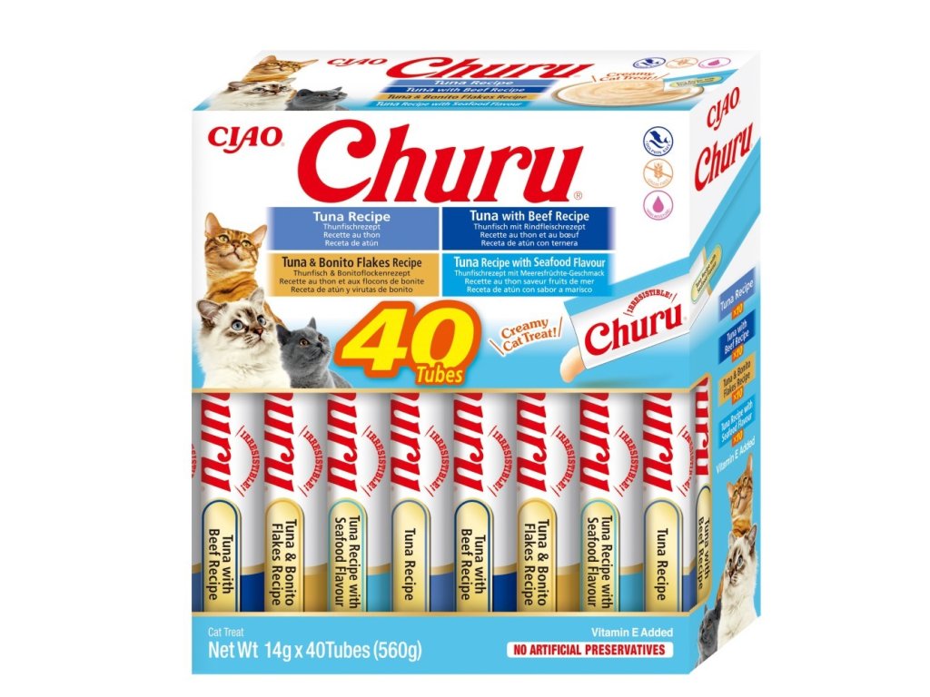 Zdravé mlsání s nízkým obsahem kalorií, bez konzervantů, chemických aromat, bez barviv a umělých dochucovadel. Inovativní měkká konzistence pamlsku Churu vám umožní trávit společné chvíle s vaší kočičkou hravým a interaktivním způsobem. Kočičí pamlsky Churu mají vysoký obsah vody a díky tomu jsou vhodným doplňkem k suchému krmivu nebo pro kočky, které málo pijí. 100% přírodní a zdravé mlsání pro kočičky všech věkových kategorií. Churu jsou ideální pro ukrytí tablety na odčervení či jiného léku, který je potřeba kočce nenásilně podat. Balení obsahuje celkem 40 pamlsků: 10x tuňák 10x tuňák s hovězím 10x tuňák s vločky z tuňáka pruhovaného 10x tuňák s příchutí mořských plodůSložení:tuňák: tuňák 30,0%, tapioka (sušená), výtažek z tuňáka, kolagen.tuňák s hovězím: tuňák 28,2%, tapioka (sušená), hovězí 1,8%, výtažek z tuňáka, kolagen.tuňák a vločky z tuňáka pruhovaného: tuňák 29,0%, tapioka (sušená), vločky z tuňáka pruhovaného 1,0%, výtažek z tuňáka, kolagen.tuňák s příchutí mořských plodů: tuňák 30,0%, tapioka (sušená), výtažek z tuňáka 0,5%, výtažek z hřebenatky 0,3%, výtažek z kraba 0,3%, kolagenový výtažek, kolagen.Deklarované jakostní znaky: protein 8,5%, tuk 0,5%, popel 1,5%, vlhkost 86,0%Energie 440kcal/kgDoplňkové parametry