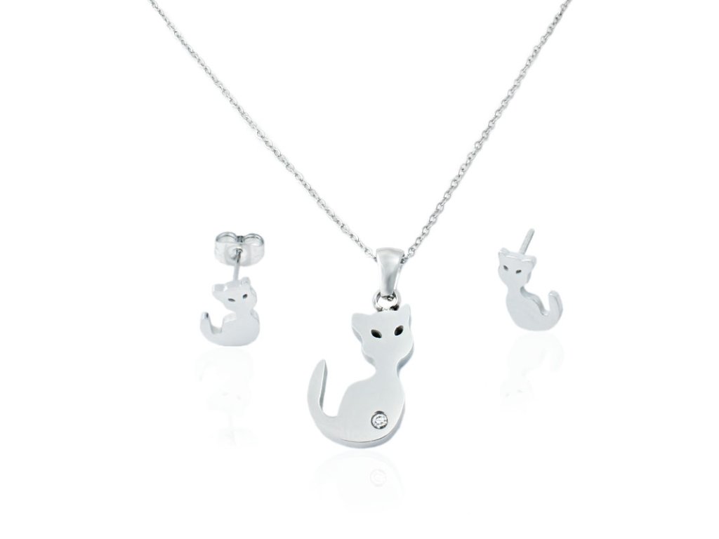 Dámský set náušnice a řetízek s přívěskem kočka z chirurgické oceli S11122060