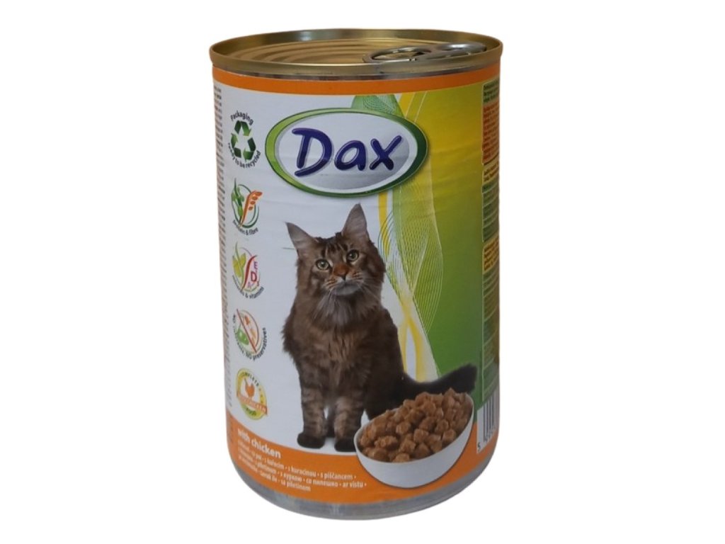Dax konzerva s kousky drůbeže v chutné omáčce je kompletní krmivo pro dospělé kočky. Složení: maso a výrobky živočišného původu 29% (drůbeží 4%), obiloviny, ryby a vedlejší výrobkyz ryb, minerální látky.Analytický složky: vlhkost 82%, hrubý protein 7%, hrubý tuk 4%, popel 3%, hrubý popel 2,5%, hrubá vláknina 0,5%.Nutriční doplňkové látky na 1 kilogram: vitamin A 1100 I.U./ME/MO, vitamin D3 140 I.U./ME/MO, vitamín E 15 mg, Zn 10 mg, Mn 2,5 mg. Krmný návod: dospělým kočkám (cca 4 kg) podávejte 1/2 konzervy denně, rozdělenou na 2 části. Podávejte ohřáté na pokojovou teplotu.Po otevření skladujte v ledničce a spotřebujte max. do 2 dní. Určeno pouze pro krmení domácích zvířat.Čerstvá pitná voda musí být neustále k dispozici.Doplňkové parametry