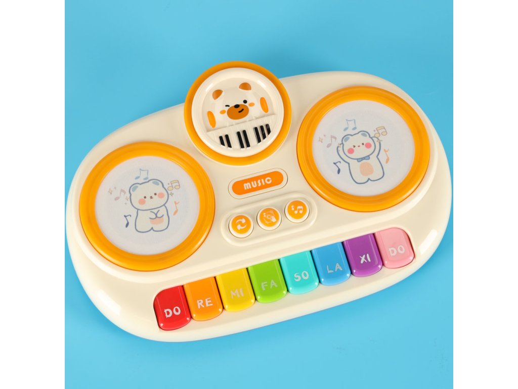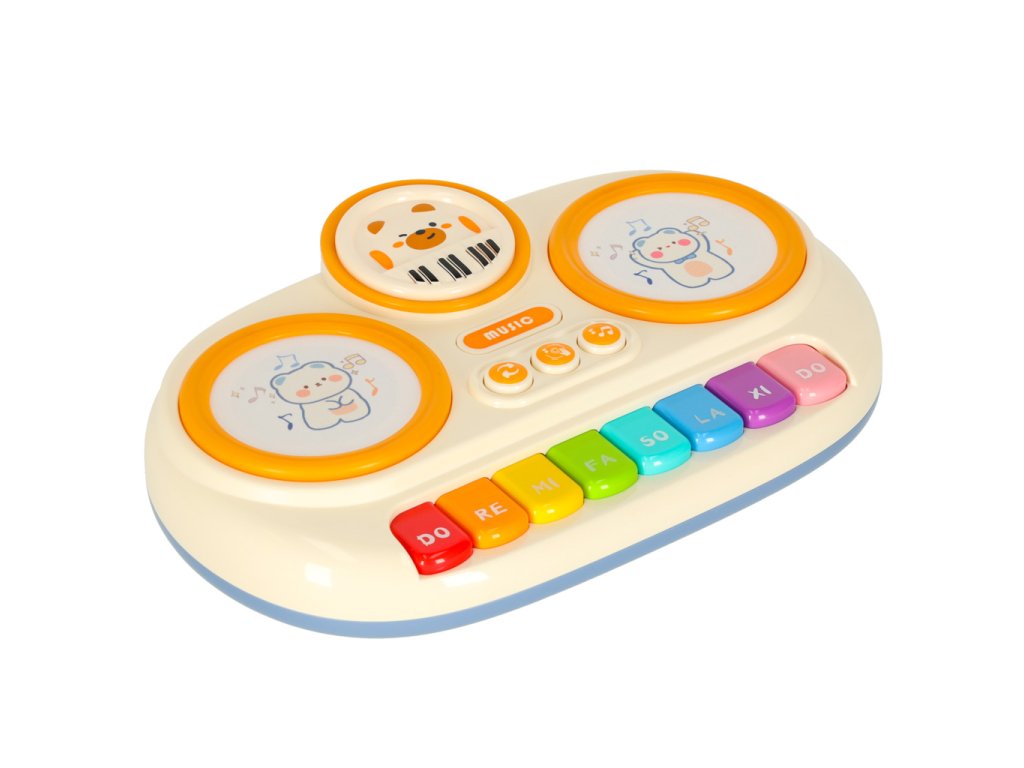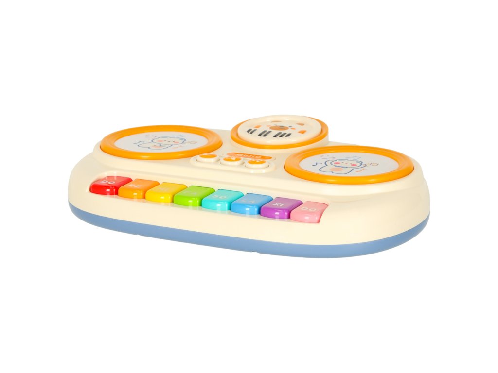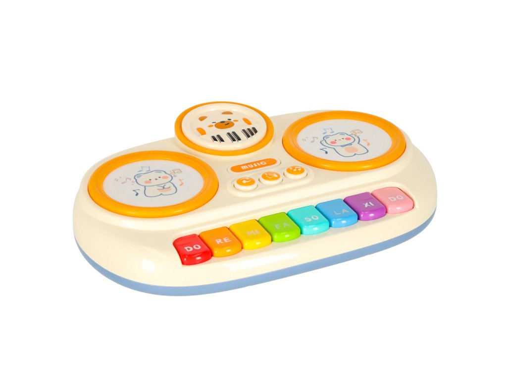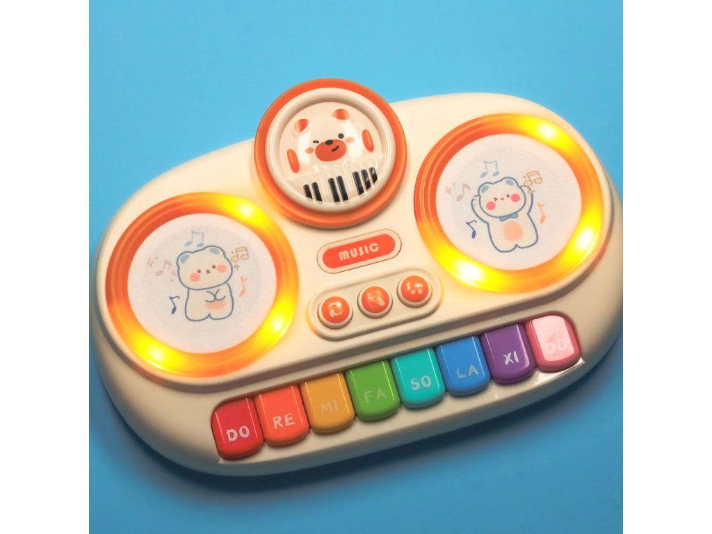 Tato vzdělávací hračkapiano obsahuje různé režimy hraní - od klasických zvuků až po rytmičtější sekvence obohacené světly. Ideální pro učení barev, rytmu a rozvoj hudebního sluchu. Kromě toho stojí za zmínku izajímavá funkce - kulaté dílky s měkkou povrchovou úpravou, které fungují jako mini bubínky. Stačí, aby do nich batole udeřilo rukou, a hračka začne hrát rytmické zvuky bubínků s melodií, čímž dítě získá pocit samostatnosti a radosti z aktivní hry.