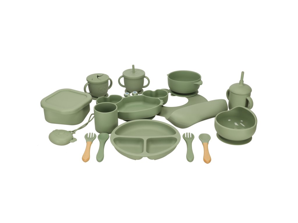 Celá sada má zelenou barvu, která z každého jídla udělá vzrušující dobrodružství. Používáním nádobí vaše dítě rozvíjí své manuální dovednosti a získává větší samostatnost.