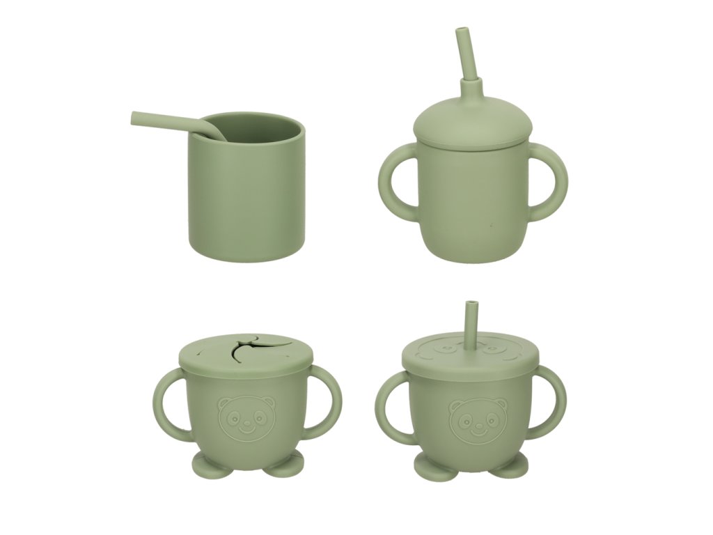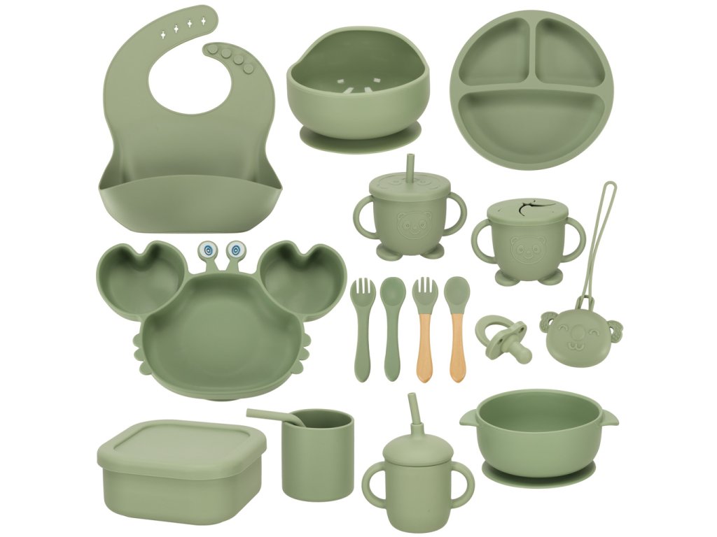 Sada nádobí je vyrobena ze silikonu vhodného pro potraviny, což zaručuje, že neobsahuje škodlivé látky a je dokonale přizpůsobena citlivým dětským ústům.