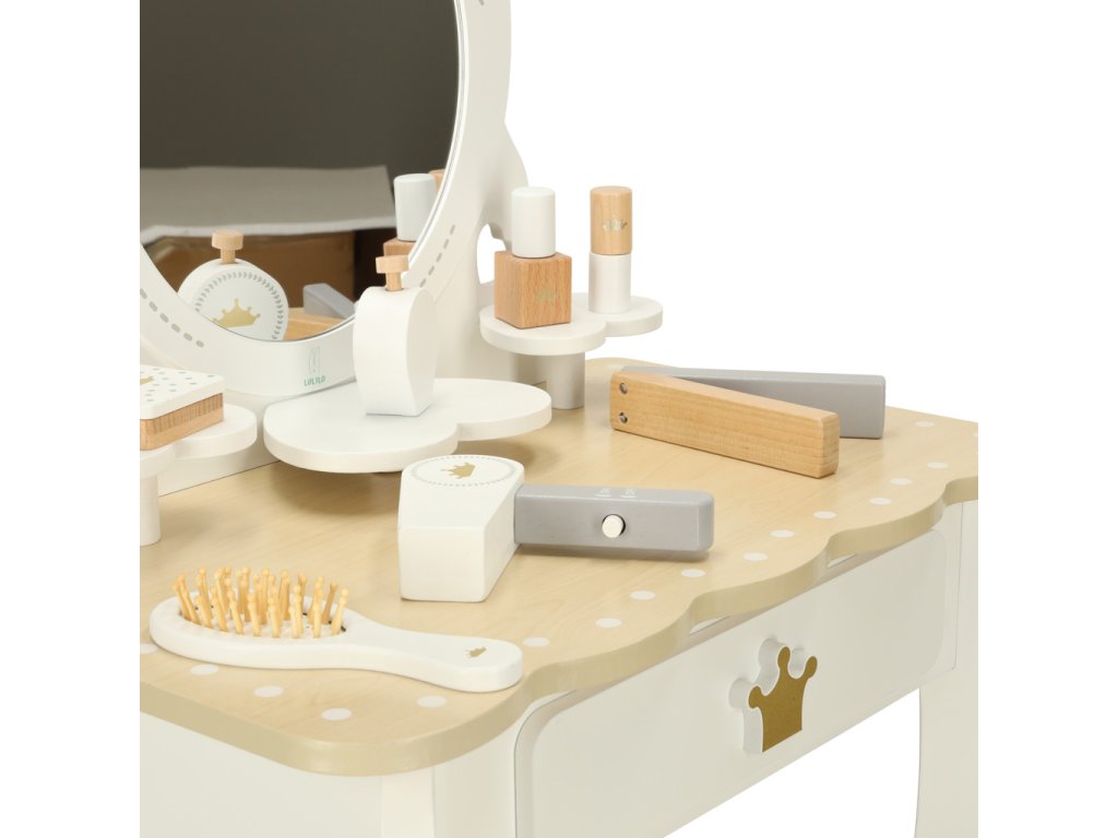 špičková kvalita zpracování - na výrobu toaletního stolku bylo použito odolné a pevné dřevo, takže hračka bude vašemu dítěti poskytovat dlouhá léta radosti.