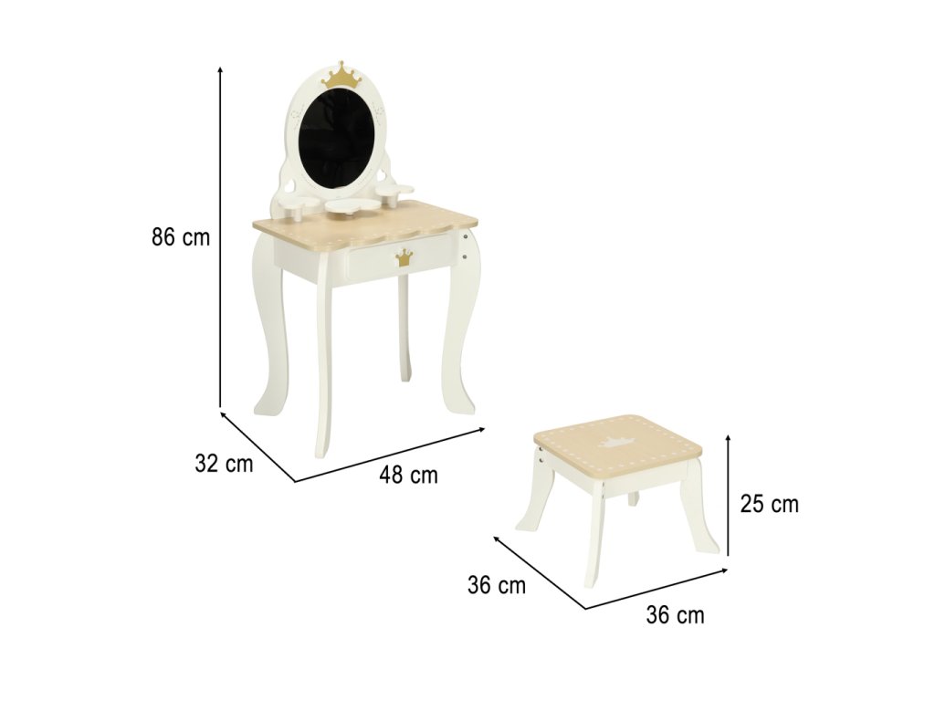 Toaletní stolek a jeho doplňky jsou vyrobeny výhradně ze dřeva, které bylo obroušeno do hladka a natřeno netoxickými barvami. Díky bílé a zlaté barvě je sada minimalistická a skvěle se hodí jako dekorace do dětského pokoje.