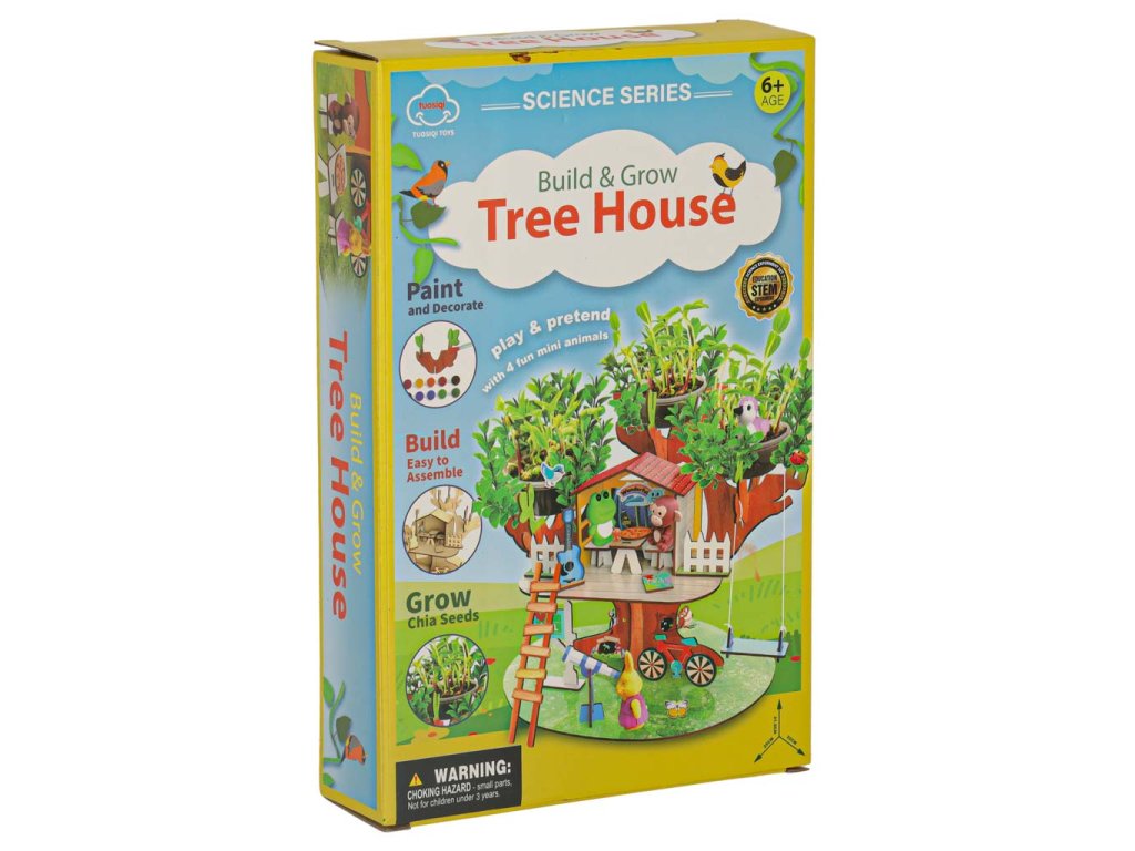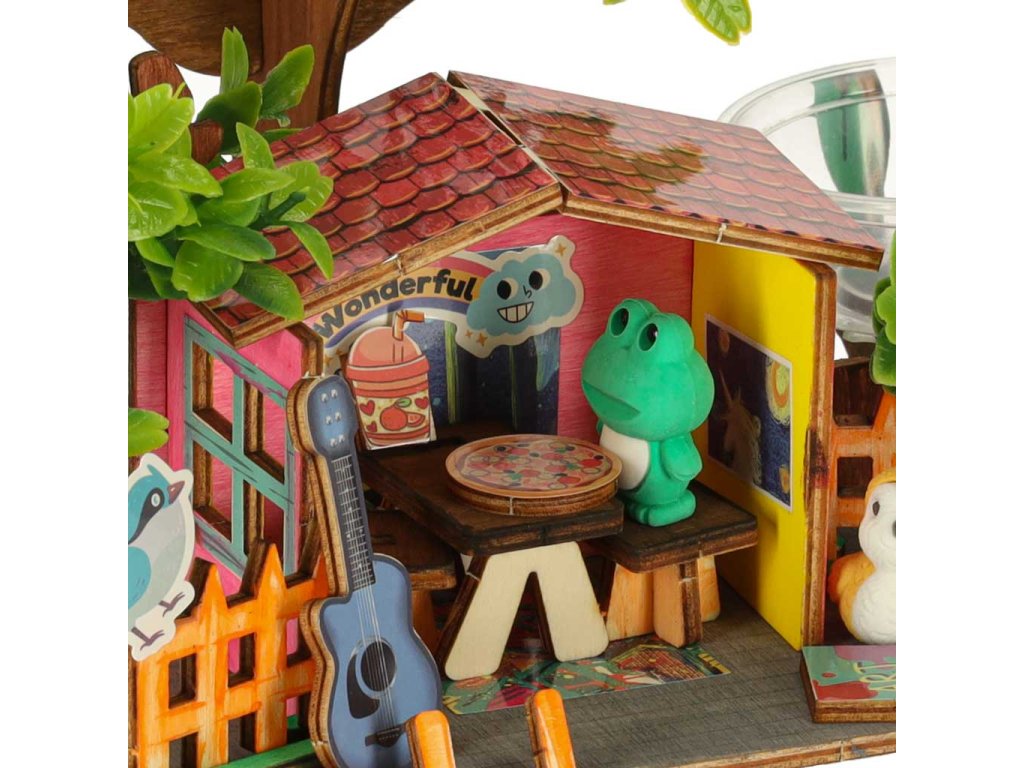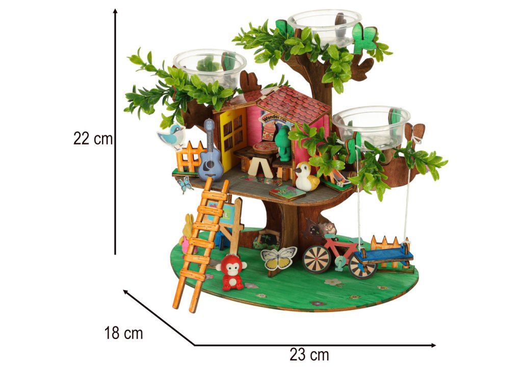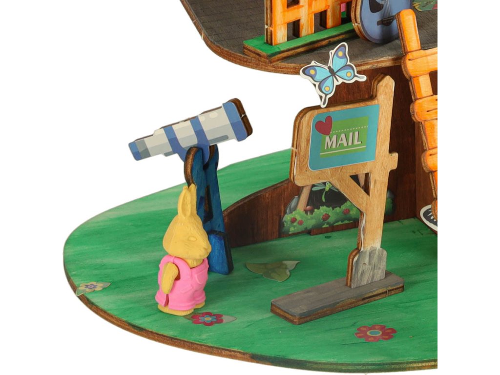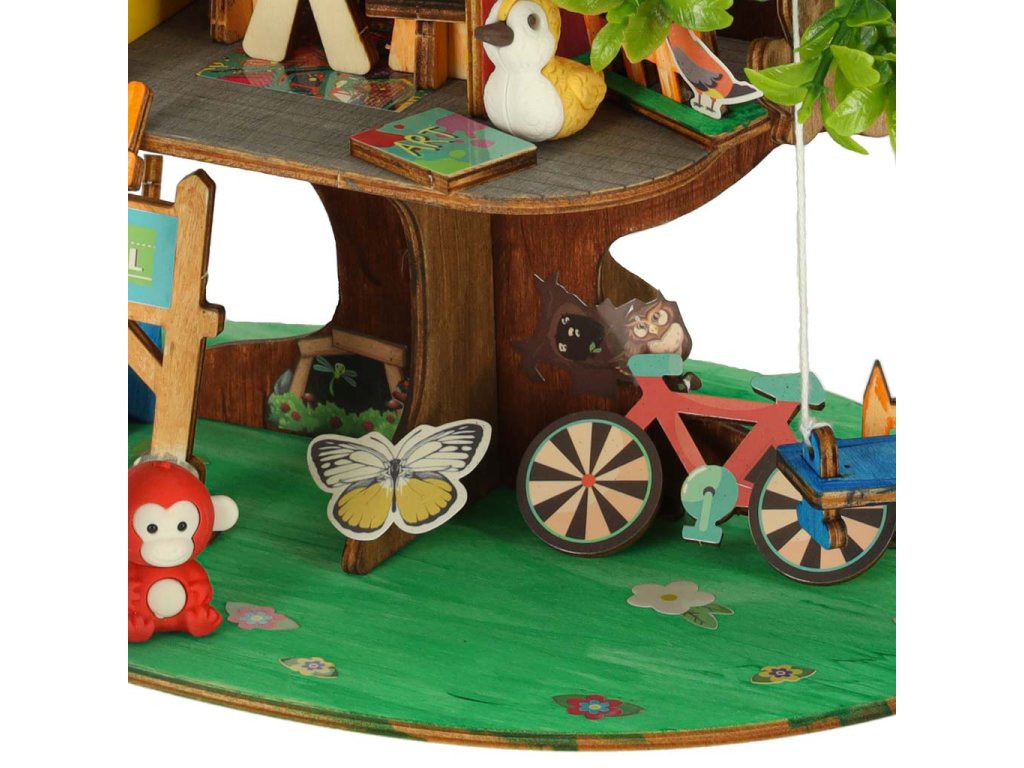 Sada obsahuje dřevěné dílky, které je třeba spojit dohromady, aby vznikl stabilní domeček. Barevné barvy, které jsou součástí balení, umožňují úplnou personalizaci dřevěné stavby. Čtyři barevné postavičky dodávají celému prostředí kouzlo a inspirují k vytváření jedinečných, kreativních příběhů, v nichž domek na stromě získá jedinečné obyvatele.