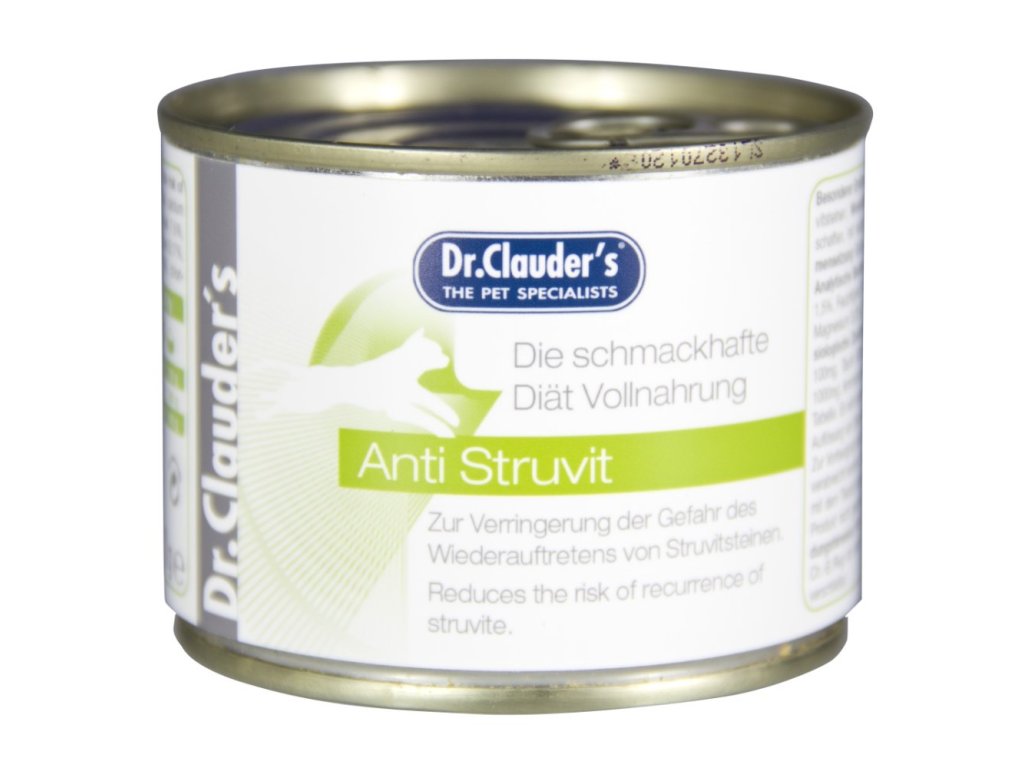 Anti Struvit - snižuje riziko recidivy struvitů. Struvitové krystaly a kameny jsou u koček častým problémem. Struvity mohou vést k podráždění a zánětu močových cest až k ucpání močové trubice. Dieta Dr.Clauder 's Anti-Struvite Diet byla speciálně navržena tak, aby zabránila vzniku struvitových kamenů. Rozpustnost struvitu a rozpouštění struvitových kamenů je podporováno kyselým pH moči. Základní nutriční vlastnosti: okyseluje moč, s nízkým obsahem hořčíku.Složení: z drůbežího masa, z hovězího masa, rýže, chlorid sodný, uhličitan vápenatý, brusinky, lososový olej.Analytické složky: hrubý protein 7,6 %, hrubý tuk 6,8 %, hrubá vláknina 0,42 %, hrubý popel 1,5 %, vlhkost 74 %, vápník 0,17 %, fosfor 0,15 %, draslík 0,23 %, sodík 0,42 %, hořčík 0,02 %, chlorid 0,72 %, síra 0,08 %.Přídatné látky/kg: Nutriční doplňkové látky: vitamín: A 5000IE, D3 150IE, E 100mg, taurin 600mg. Technologické přídatné látky: guma Cassia 1000mg, chlorid amonný 1500mg, citrát draselný 1600mg, lecitin 1200mg. Před použitím nebo prodloužením doby krmení se doporučuje poradit se s veterinárním lékařem. K rozpuštění struvitových kamenů se doporučuje doba podávání 5-12 týdnů, k prevenci opakovaného výskytu struvitových kamenů by měla být dieta podávána po dobu až 6 měsíců. V závislosti na diagnóze a průběhu onemocnění by měla být doba užívání dohodnuta s veterinárním lékařem.Vzhledem ke speciálnímu složení není přípravek vhodný pro mladá zvířata a březí, nebo kojící matky. Vždy zajistěte čerstvou vodu! Tělesná hmotnost g/den 5kg 200g 7kg 300g 10kg 400gDoplňkové parametry