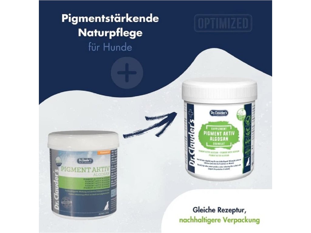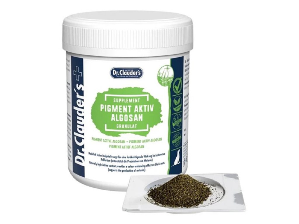 Tento speciálně vyvinutý produkt podporuje tmavou pigmentaci srsti a přináší zpět přirozenou barvu. Ideální pro psy s tmavou srstí, která ztratila barevnou intenzitu. Dr.Clauder’s Algosan obsahuje 100% přírodní mořské řasy (Ascophyllum Nodosum) bohaté na minerály, bílkoviny, vitamíny a stopové prvky. Toto přírodní složení nabízí řadu výhod pro pokožku a srst. Podporuje tmavou pigmentaci srsti. Pro lepší účinek doporučujeme kombinaci karotenu a Algosanu. Doplněk stravy obsahuje 100% přírodní mořské řasy(Ascophyllum nodosum), minerály, proteiny, vitamíny a stopové prvky v optimálním přírodním složení. Ascophyllum, má pozitivní vliv na citlivou pokožku a srst. Složení: mořské řasy 100% (ascophyllum nodosum). Analytické složky: hrubý protein 5%, hrubý tuk 3%, hrubá vláknina 6%, hrubý popel 25%.První aplikace je úspěšná při výměně srsti. Dávkování: dospělý pes:1 pol. lžíce (cca 15g) na dendo 5kg: 1/2 - 1do 10 kg: 1 1/2 nad 10 kg: 1 1/2 - 2 1/2Štěňata a junioři do 12 měsíců: 1 čajová lžička (cca 7g) až do 1 pévkové lžíce na denDoplňkové parametry