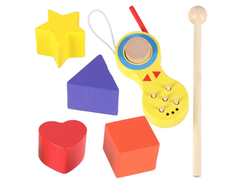 Barevné prvky přitahují oko i malé ručičky svými barvami. Díky neutrální dřevěné základně zároveň hračka nepůsobí na dítě nadměrnými podněty.