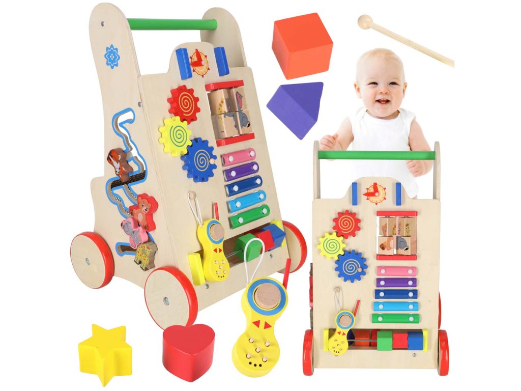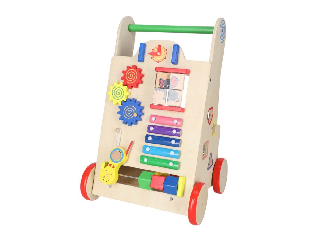 Není to jen chodítko! Tvůrci se postarali o to, aby se batolata bavila mnoha způsoby. Na přední straně kočárku je umístěna manipulační deska plná prvků, které potěší děti: