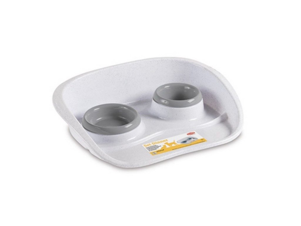 Set Dinner je podnos pro psy a kočky, který vašim čtyřnohým přátelům poskytne vodu a jídlo současně. Boční hrany zadržují unikající vodu, nebo jídlo, takže toto praktické a funkční řešení zajišťuje pořádek a čistotu. Snadné nastavení a rychlé a snadné čištění. Rozměr podložky: 46 x 35 x 11cmMisky: 0,25l a 0,3lBarva: viz fotoDoplňkové parametry