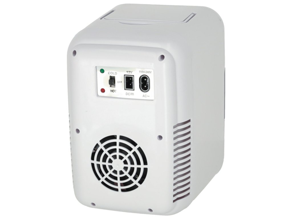 Bílá cestovní chladnička s ergonomickým designem udržuje teplotu chlazených i ohřívaných produktů. Lze ji připojit do běžné elektrické zásuvky i do zásuvky zapalovače cigaret.