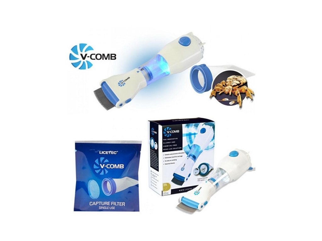 Zbavte se vší spolehlivě a bez chemikálií. V-COMB elektrický odstraňovač vší a hnid je určený k pročesávání napadených vlasů. Uvolňuje hnidy z vlasového vlákna a odsává je spolu s aktivními parazity do záchytného filtru uvnitř přístroje. Výsledek zaznamenáte okamžitě. Speciální modré světlo průhledné komory umožňuje dobrou viditelnost vší a hnid, které se zachytí ve filtru. V-COMB elektrický odstraňovač vší a hnid je vhodný pro všechny typy vlasů a je elegantní alternativou šamponů na odstranění vší, které mohou alergizovat a obtížně se smývají.