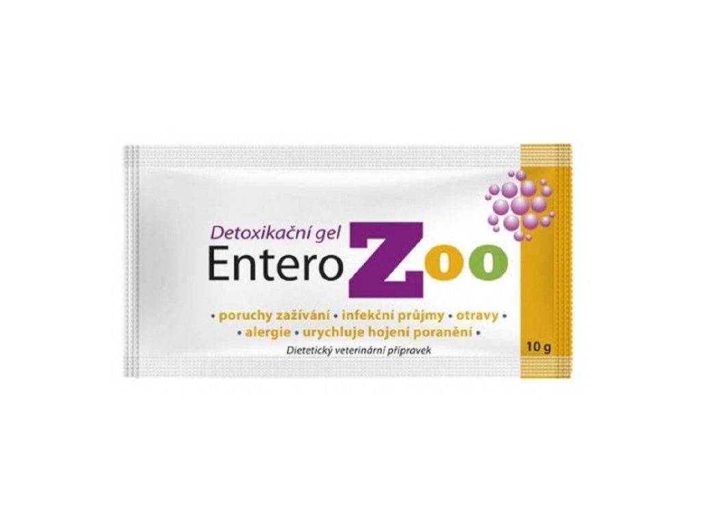 Gel Entero zoo slouží k celkové detoxikaci trávicího traktu u psů a koček, dokáže na sebe navázat středněmolekulární toxické látky, patogenní bakterie,alergeny a odvádí je z organizmu. Zabraňuje tak jejich usazování v těle a napomáhá tak udržet celý organismus a zažívání v přirozené formě. Entero zoo dokáže zmírnit průběh infekčních průjmů, otrav a alergií. Pokud užívá Váš pes antibiotika, je vhodné mu Entero zoo podávat - posílí účinek antibiotik a urychluje tak léčbu. Entero zoo je prověřeno mnoha studiemi, kde byla dokázána jeho vysoká účinost a nebyly dosud zjištěny žádné vedlejší nežádoucí reakce.EnteroZOO vrátí Vašeho mazlíčka zpátky do života Způsob použití a dávkování: unikátní veterinární detoxikační gel na bázi organického křemíku. Je bez chuti a vůně, zvířata jej obvykle přijímají bez problémů a je určen pro přímou aplikaci do dutiny ústní zvířete. Složení polyhydrát polymethilsiloxanu 60 %, voda čištěná 40 %. Enterosorbent - EnteroZOO doporučujeme užívat již při prvních příznacích nemoci nebo otravy. EnteroZOO® lze zvířatům podávat různými způsoby: přímo do tlamy, přimíchat do krmiva, dát na pamlsek, rozmíchat v přiměřeném množství vody a podávat plastovou stříkačkou do dutiny ústní, rozmíchat v malém množství vody do napáječky apod. Standardní dávkování podle druhu zvířete a váhy:(Orientačně je množství takto: 1 kávová lžička = 5g = sáčku,1 kávová lžička s kopečkem = 10g = obsah sáčku, 1 polévková lžíce = 15g = 1 a sáčku. EnteroZOO se nevstřebává, nemusíte se tedy obávat předávkování při omylem podané větší dávce.)Psi a štěňata:do 4 kg 1 kávové lžičky 1-3x denně,do 15 kg 1 kávová lžička 1-3x denně,15 – 50 kg 1 vrchovatá kávová lžička 1-3x denně,od 50 kg výše 1 polévková lžíce 1-3x denněPodávat přímo do tlamy nebo přimíchat do krmiva nebo na pamlsek nebo rozmíchat v přiměřeném množství vody a podávat plastovou stříkačkou do tlamy.Kočky a koťata:do 2 kg 1 kávové lžičky 1-3x denně,od 2 kg 1 vrchovatá kávová lžička 1-3x denněPodávat přímo do tlamy nebo přimíchat do krmiva nebo rozmíchat v přiměřeném množství vody a podávat plastovou stříkačkou do tlamy.Králíci, morčata, fretky, nutrie apod.: kávové lžičky 1-3x denně rozmíchat do malého množství napájecí vody nebo podávat rozmíchané v přiměřeném množství vody plastovou stříkačkou do dutiny ústní.Křečci, myši, potkani apod.: 1/3 kávové lžičky 1-3x denně rozmíchat do malého množství napájecí vody nebo podávat rozmíchané v přiměřeném množství vody plastovou stříkačkou do dutiny ústní.Exotické ptactvo: 1 kávová lžička 1 denně rozmíchat do 1 dcl napájecí vody, každý den připravovat roztok nový.Drůbež: 1 polévková lžíce 2x denně rozmíchat do 1l napájecí vody.Prasata a selata, skot a telata, kozy a kůzlata, ovce a jehňata, koně a hříbata:0,5 g na 1 kg tělesné hmotnosti 3x denně rozmíchat v přiměřeném množství vody a podávat plastovou stříkačkou do dutiny ústní.Akutní průjem: první dávka – dvě standardní jednorázové dávky, a dále jednorázová dávka po každé defekaci. Po zastavení průjmu se doporučuje užívat EnteroZOO dále po dobu 5 dnů ve standardní dávce podle váhy.Závažná otrava nebo intoxikace:První dávka – dvě standardní jednorázové dávky a pak standardní dávka každou hodinu po dobu 24 hodin. Při známkách otravy podejte ihned dvojnásobnou dávku EnteroZoo a vyhledejte veterinárního lékaře. EnteroZOO do sebe vstřebá toxické látky a tím zajistíte zvířeti při otravě první pomoc! Profylaktická detoxikace organismu1 standardní jednorázová dávka 3x denně po dobu 10-14 dnů. Aplikace na kůžiEnteroZOO můžete aplikovat také na postižená místa kůže zvířete při různých zánětech, ekzémech, alergických projevech, poranění kůže apod. Naneste na postižené místo silnější vrstvičku gelu, která se po zaschnutí odrolí nebo si ji zvíře olíže. V těchto případech doporučujeme současné podávání vnitřně i zevně. Doporučení týkající se délky léčbyV případě akutní otravy se doporučuje užívat EnteroZOO po dobu 3-5 dnů. V případě chronických intoxikací a alergických onemocnění se doporučuje užívat přípravek po dobu 2-3 týdnů.Vedlejší účinky: nebyly zaznamenányDoplňkové parametry