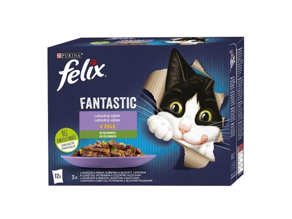 Krmivo obsahuje křehké masité plátky ve šťavnatém želé, které nejen skvěle vypadají, ale hlavně chutnají. V tomto multipacku najdete celkem 12 kapsiček ve čtyřech příchutích - 3x hovězí v želé s mrkví, 3x kuře v želé s rajčaty, 3x losos v želé s cuketou, 3x pstruh v želé se zelenými fazolkami .Složení - hovězí v želé s mrkví: maso a výrobky živočišného původu (14% z toho hovězí 4%), bílkovinné extrakty rostlinného původu, ryby a vedlejší výrobky z ryb, minerální látky, cukry.Složení - kuře v želé s rajčaty: maso a výrobky živočišného původu (14% z toho kuře 8%), bílkovinné extrakty rostlinného původu, ryby a vedlejší výrobky z ryb, minerální látky, cukry.Složení - losos v želé s cuketou: maso a výrobky živočišného původu (12% z toho losos 4%), bílkovinné extrakty rostlinného původu, ryby a vedlejší výrobky z ryb, minerální látky, cukry.Složení - pstruh v želé se zelenými fazolkami: maso a výrobky živočišného původu (12 z toho pstruh 4%), bílkovinné extrakty rostlinného původu, ryby a vedlejší výrobky z ryb, minerální látky, cukry.Vitamíny: Vitamin A: 655 m.j./kg, Vitamin D: 100 m.j./kg, Vitamin E (alfa-tokoferol): 15 mg/kg, Obsah vitaminů je zaručen do data minimální trvanlivosti.Deklarované jakostní znaky: vlhkost 82,0%, proteiny 11,5 %, tuky a oleje 2,5%, popel 2.5 %, hrubá vláknina 0,05 %, kyselina linoleová (Omega 6m.k.) 0,4%.Doplňkové parametry