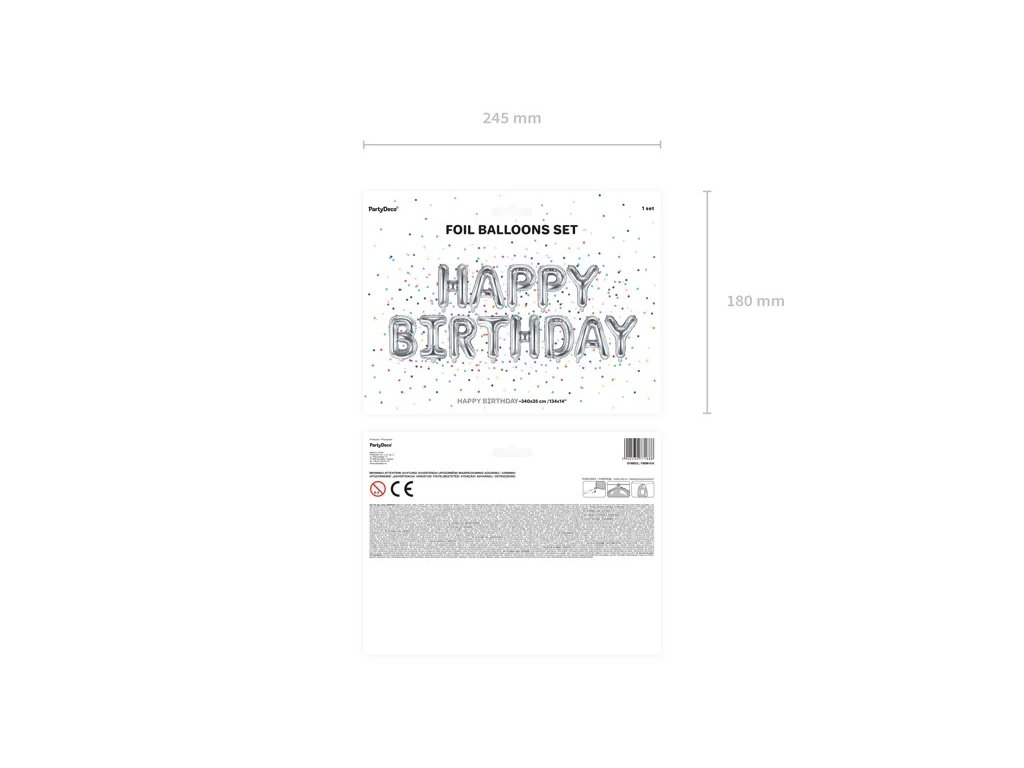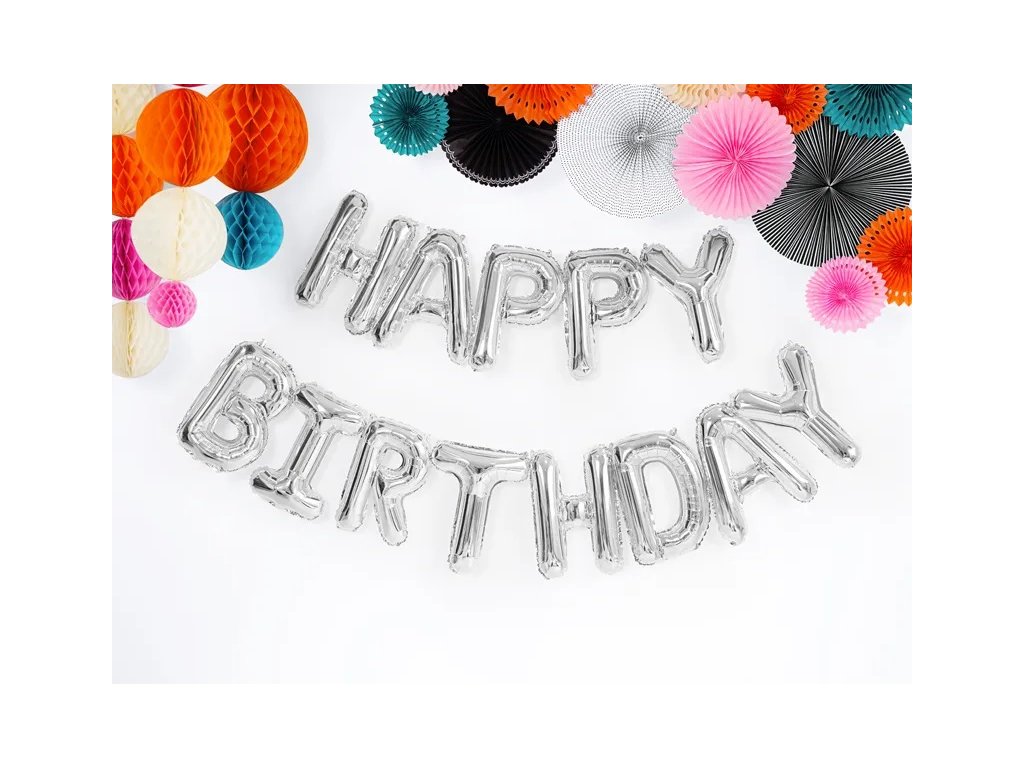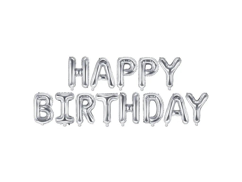 Balónek z metalizované fólie Happy Birthday ve stříbrné barvě.
