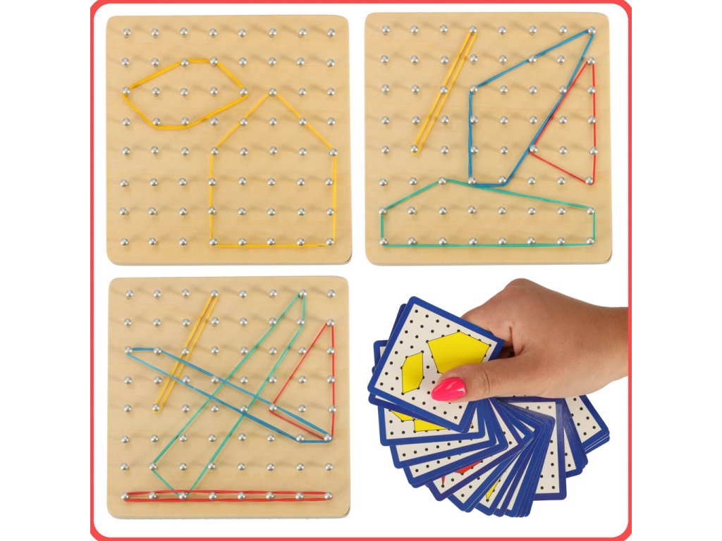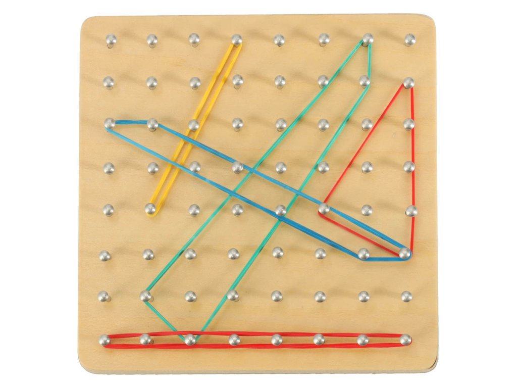 Geoboard je dřevěná deska s napůl zatlučenými hřebíky, na které se pomocí gumiček vytvářejí různé tvary. Cílem je seznámit dítě se základy matematiky, jako je poznávání tvarů nebo symetrie a úhlů.