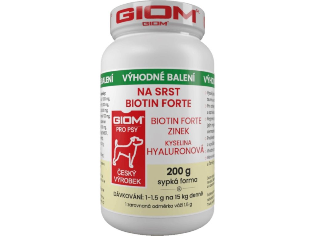 Vysoký obsah biotinu, zinku, taurinu a vitamínu E. Pro zdravý vývoj kůže, lest a správné zbarvení srsti. Regeneruje kůži a působí proti jejím negativnim dermatologickým projevům. Podávejte v období línání, před a v průběhu výstavní sezony. Vhodné pro psy a kočky. Velmi vhodné pro bílé a černé psy. Podávejte minimálně 1 měsíc.Složení v 1kg: Vitamin E (jako Alfatokoferol) 7 700mg, Vitamin B1 800mg, Vitamin B2 800mg, Vitamin B6 700mg, Biotin 2 500mg, Vitamin C 20 000mg, Niacinamid 3 500mg, Pantotenan vápenatý 2 000mg, Zn - chelát zinku 6 000mg, Taurin 5 000mg. Denní dávkování prášku: 1-1,5 g na 15 kg živé hmotnosti denně.1 zarovnaná odměrka je na 15-20 kg. Odměrka je součástí balení.Podávejte minimálně 1 měsíc. Trvalé podávání je možné.Při hmotnosti 15 kg vystačí balení 200g na 200 dní.Při hmotnosti 30 kg vystačí balení 200g na 100 dní.Doplňkové parametry