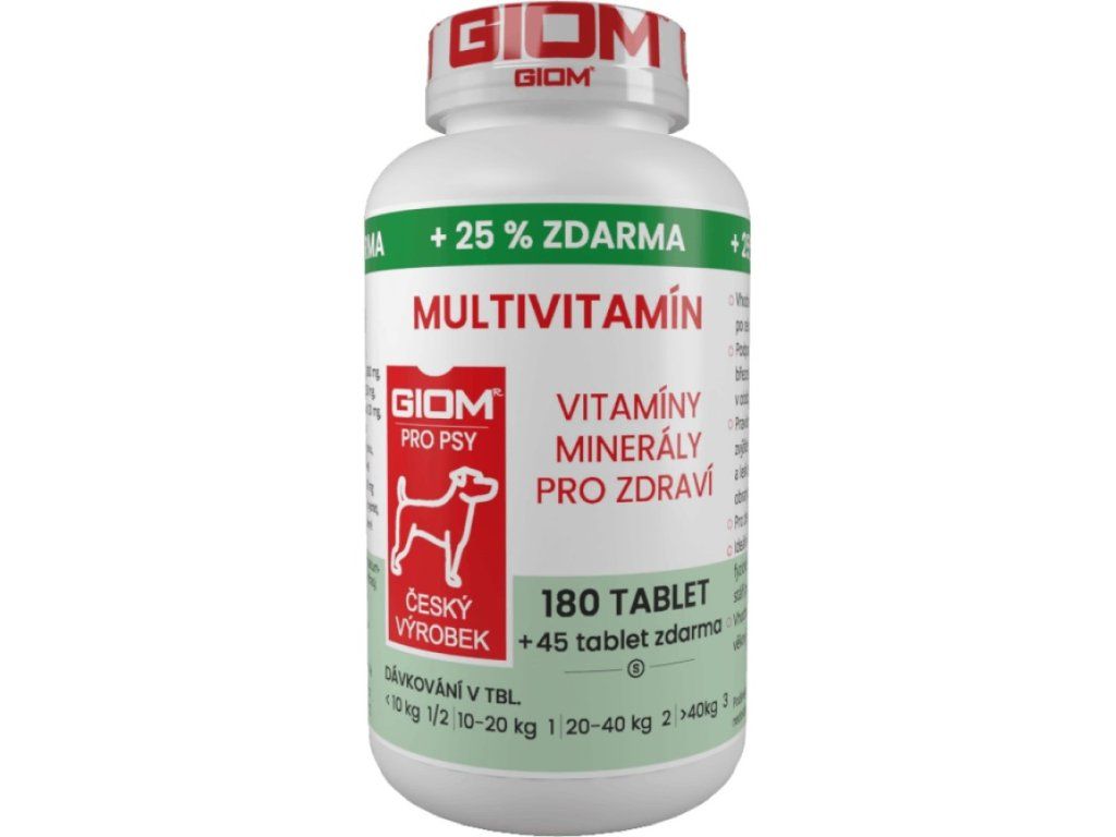 Podávání je vhodné u starších psů, kdy je schopnost vstřebávání z potravy snížena. Zvyšuje také imunitu a zlepšuje kondici. Ideální doplněk v období fyzické zátěže či v období stáří psů, zlepšuje kondici psa. Podporuje správný průběh březosti a velmi vhodný v období laktace fen. Bez umělých barviv a konzervantů. Český výrobek s ověřenou účinností.Pravidelným podáváním zvýšíte celkovou imunitu.Složení v 1 kg: Vitamin E (jako Alfatokoferol) 5 000 mg, Vitamin B1 1 000 mg, Vitamin B2 1 000 mg, Vitamin B6 800 mg, Vitamin B12 5 mg, Vitamin K3 5 mg, Vitamin C 30 000 mg, Biotin 250 mg, Kyselina listová 120 mg, Taurin 5 000 mg, Železo - chelát Fe 800 mg, Zinek - chelát Zn 2 700 mg, Mangan - chelát Mn 1 200 mg, Vápník Ca 120 g, Fosfor P 30 g, Hořčík Mg 6 g, D,L-Methionin 25 g Váha do 10 kg - 1/2 tbl. denně10 - 20 kg - 1 tbl. denně20 - 40 kg - 2 tbl. denněnad 40 kg - 3 tbl. denněPodávejte minimálně 1 měsíc. Trvalé podávání je možné.Při hmotnosti psa 30 kg vystačí balení 180 tablet na 3 měsíce.Doplňkové parametry