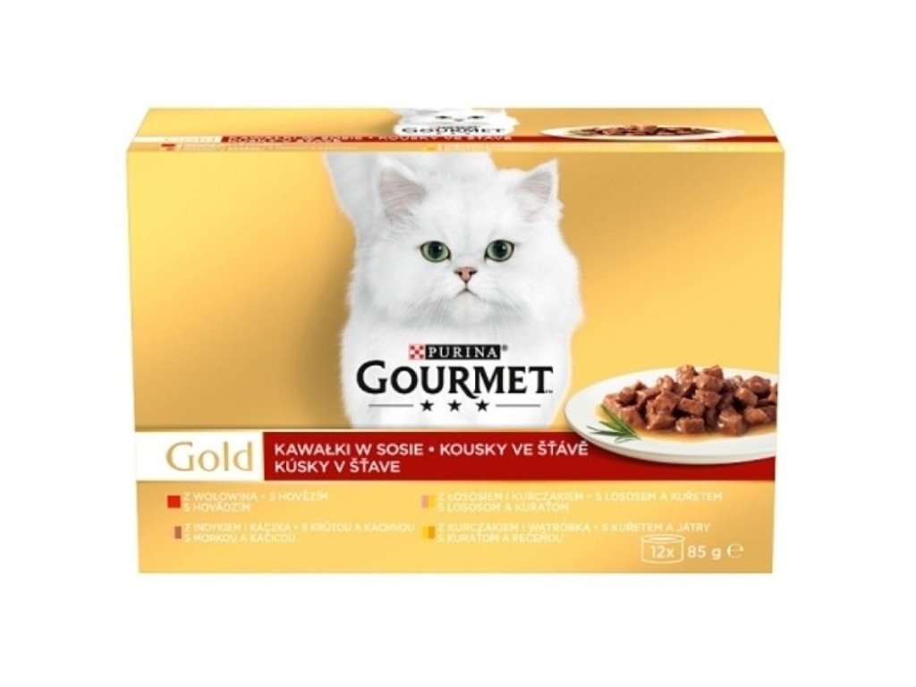 Kompletní krmivo pro dospělé kočky Gourmet Gold ve formě konzerviček s křehkými kousky masa ve šťávě. Multipack obsahuje lahodné receptury s hovězím, krůtou, kachnou a lososem. Vhodné pro vybíravé kočky.Multipack obsahuje / složení: 3x s hovězím: maso a výrobky živočišného původu (z toho hovězí 4 %), obiloviny, minerální látky, cukry 3x s krůtou a kachnou: maso a výrobky živočišného původu (z toho krůta 4 %, kachna 4 %), obiloviny, minerální látky, cukry 3x s lososem a kuřetem: maso a výr. živ. původu (z toho kuře 4 %), ryby a vedlejší výrobky z ryb (z toho losos 4 %), obiloviny, minerální látky, cukry 3x s kuřetem a játry: maso a výrobky živočišného původu (z toho kuře 4 %, játra 4 %), obiloviny, minerální látky, cukryAnalytické složky: vlhkost 82,0 %, protein 7,0 %, obsah tuku 3,2 %, obsah anorganických látek 2,1 %, hrubá vláknina 0,07 %.Doplňkové látky: Nutriční doplňkové látky: M.j./kg: Vit. A: 625 Vit. D3: 95. Mg/kg: síran železnatý monohydrát 22,1, jodičnan vápenatý bezvodý 0,28, síran měďnatý pentahydrát 2,5, síran manganatý monohydrát 4,3, síran zinečnatý monohydrát 36.Doplňkové parametry