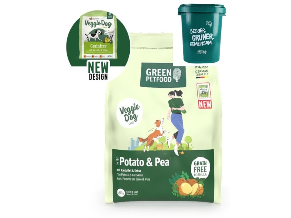 U některých psích jedinců se mohou objevit alergické reakce na živočišné bílkoviny, nebo součásti masité stravy: Veggie Dog Potato&Pea (původně GPF Grainfree) nabízí zdravou alternativu pro zajištění přísunu všech důležitých živin a látek. Neobsahuje obiloviny ani žádné živočišné složky, maso nebo vedlejší živočišné výrobky. Můžete tak toto z 99,99% veganské prémiové krmivo podávat psům citlivým nebo alergickým na živočišné bílkoviny, lepek nebo pšenici. Zdrojem energie jsou v tomto krmivu brambory a hrášek. Díky nízkému obsahu bílkovin nezatěžuje orgány a urychluje látkovou výměnu. Díky obsahu mastných kyselin, celé řadě vitamínů, zinku a mědi nebude Vašemu pejskovi nic chybět. Bylinky, ovoce a řasy, které obsahují celou řadu životně důležitých látek, přispívají k celkové kondici zvířete a ovlivňují také kvalitu srsti. Moderní německé krmivo, které prospívá nejen Vašemu psovi, ale také přírodě!Složení: brambory (dehydrované) 17,5%, sušené batáty, hrachová mouka (přírodní zdroj aminokyselin) 17%, bramborový protein, rostlinný olej, kvasnice (částečné hydrolyzované), jablečná vláknina, řepné řízky, minerální látky,rostlinné bílkoviny (hydrolyzované), kořen čekanky (mletý, přírodní zdroj inulinu), byliny, ovoce 0,10%.Deklarované jakostní znaky: protein 22,0%, tuk 14,0%, hrubá vláknina 3,2%, hrubý popel 6,0%, vápník 0,85%, fosfor 0,65%.Přídatné látky: nutriční látky: vitamín A 16000 I.E., vitamín D3 1200 I.E:, vitamín E 130mg, vitamín C 100mg/kg, vitamín B1 10mg, vitamín B2 15mg, vitamín B6 15mg, vitamín B12 70mcg, niacin 60mg, kyselina pantotenová 40 mg/kg, kyselina listová 4mg/kg, L-catnitin 250mg/kg, taurin 1,0mg/kg biotin 600mcg,Metabolická energie: 3.717 kcalDoplňkové parametry