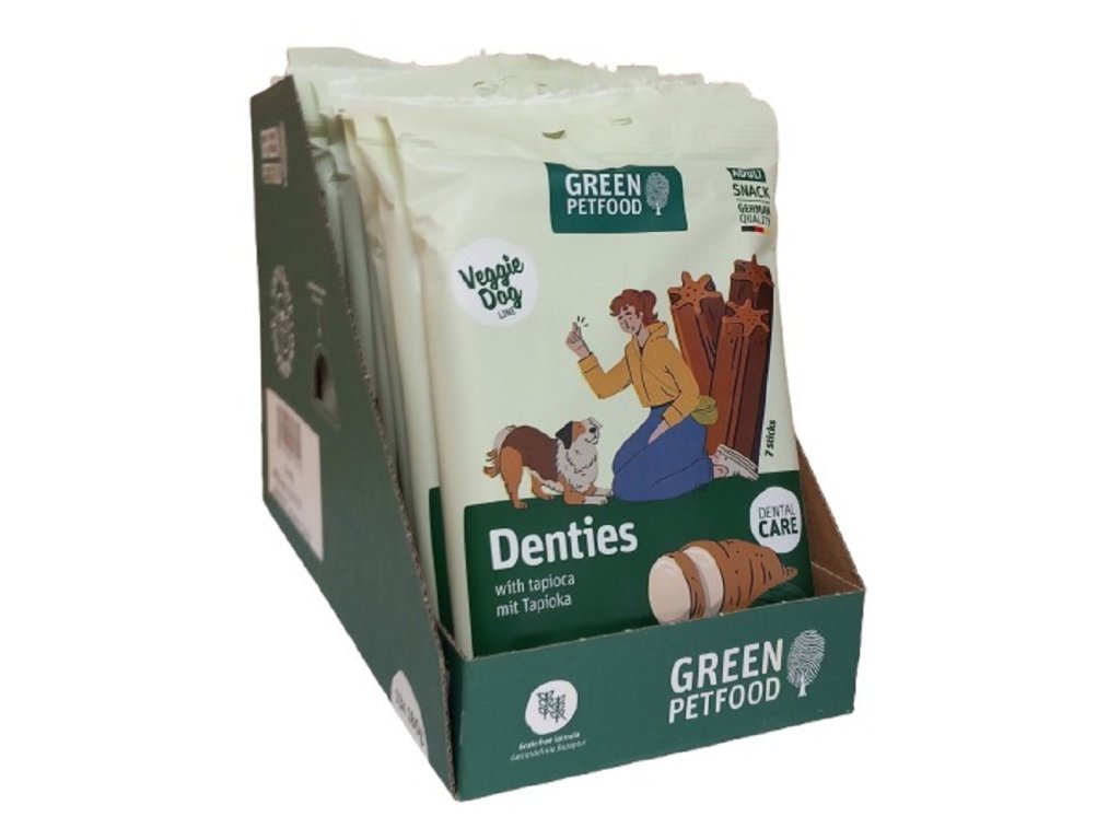 Dentální pamlsek bez obilovin je ideálním doplňkem oblíbeného krmiva VeggieDog. 100% veganské! Vyvinuto s odborníky na výživu a veterináři v Německu. Pouze z těch nejlepších surovin. Výsledkem je pamlsek s hvězdicovitou strukturou, který podporuje žvýkání. Díky celulóze je ideální pro podporu každodenní zubní hygieny - včetně masáže dásní! Místo masa použita chutná tapioka. Vhodné i pro citlivé psy. Složení: sušená tapioka 40%, sušená brambora; glycerol (bylinný původ), bramborový škrob; celulóza 4%, hydrolyzované kvasink, minerální látkyAnalýza: obsah bílkovin 5,0 %, obsah tuku 1,0 %, hrubá vláknina 4,5 %, hrubý popel 5,0 %, vlhkost 23,0 %.Přídavné látky: Nutriční přísady na kg: sorban draselný 4 000 mg/kg, kyselina citronová 15 000 mg/kg.Doplňkové parametry
