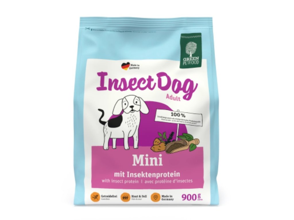 Krmivo Green Petfood InsectDog Mini je dokonalým krmivem pro malé psy s citlivostí na krmivo! Je plné chuti díky lahodné receptuře s hmyzími bílkovinami a bylinkami. Toto krmivo pro psy s živočišnými monoproteiny pro dospělé psy malých plemen má navíc vynikající míru přijatelnosti, protože neobsahuje obiloviny a je lehce stravitelné. Krmivo pro citlivé psy malých plemen obsahuje hmyzí bílkovinu. Jedná se o trvale udržitelný zdroj bílkovin číslo jedna pro budoucnost. Hodovat na chutném krmivu a šetřit planetu.Složení: 20,0% hmyz, sušené sladké brambory, hrachová mouka (přírodní zdroj aminokyselin), 13,0% drůbeží tuk, bramborová bílkovina, sušené brambory, řepná vláknina, částečně hydrolyzované kvasnice, minerální látky, byliny, ovoce. Deklarované jakostní znaky: hrubý protein 25%, hrubý tuk 16,0%, hrubá vláknina 3,5%, hrubý popel 6,9%, vápník 0,95%, fosfor 0,70% Doporučené množství krmiva je uvedeno na zvíře a den na základě cílové hmotnosti dospělého jedince. Vezměte prosím na vědomí, že uvedená množství jsou pouze orientační a musí být přizpůsobena výživnému stavu vašeho zvířete a jeho aktivitě. Dbejte na to, aby vaše zvíře mělo neustále k dispozici čerstvou vodu. váha psa neaktivní a starší pes normálně aktivní aktivní 2 kg 35g 45g 50g 5 kg 55g 75g 85g 10 kg 85g 110g 135g 20 kg 140g 195g 245g 30 kg 190g 265g 335gDoplňkové parametry