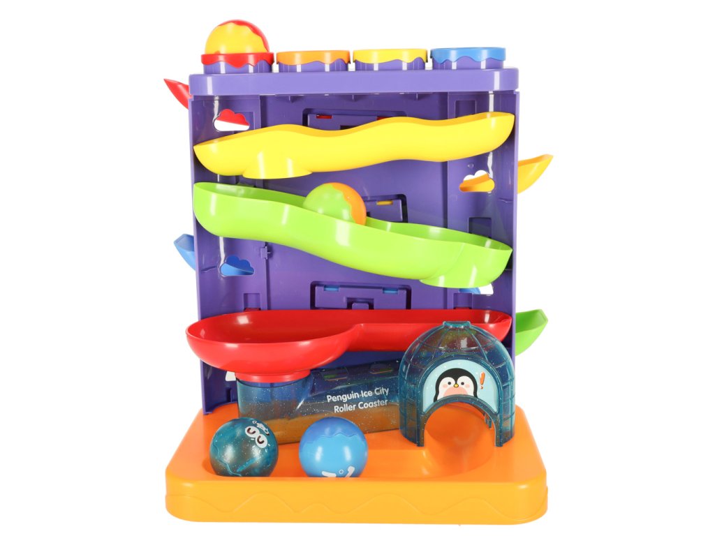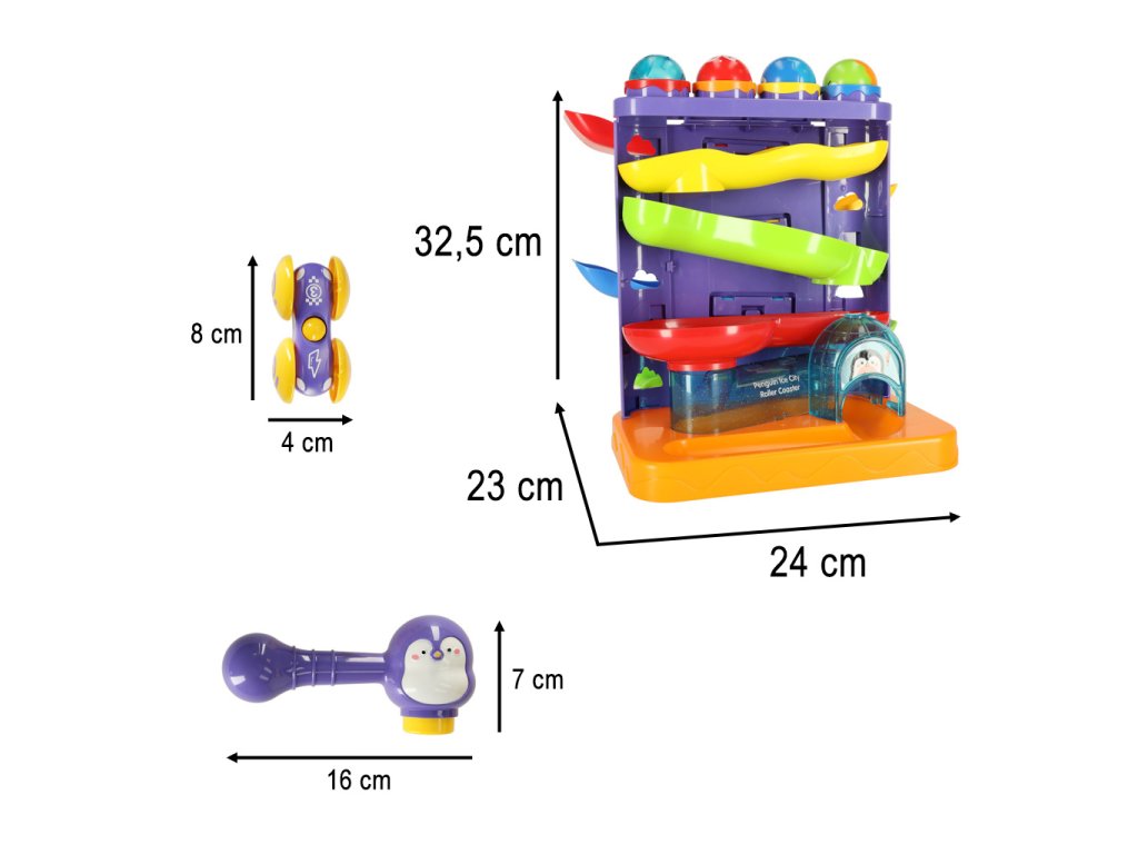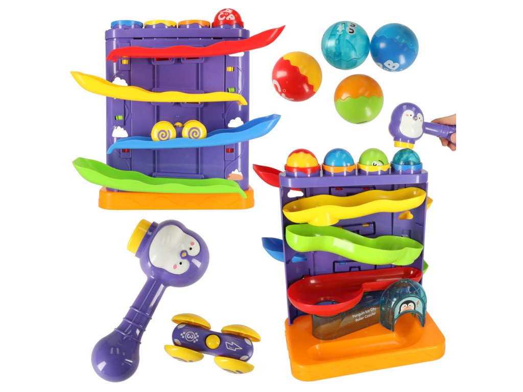 Interaktivní kuličková dráha 3 v 1 s kladívky tučňák + auto