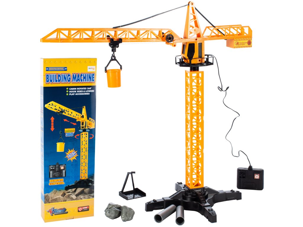 Jeřáb s kyblíkem na dálkové ovládání RC. Výška: 55 cm. Je ovládán kabelem a může se otáčet o 360 stupňů. Napájení ovladače vyžaduje 3 x AA baterie (nejsou součástí balení). Rozměry balení: 20,5 x 6 x 64 cm. V balení naleznete také: kyblík, speciální platformu, 3 imitace kamenů, 2 roury.Doplňkové parametry