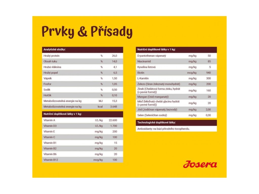 Velká a obří plemena jsou mohutná, jejich kostra je zatěžována vyšší hmotností a proto potřebují výživu adekvátní svým potřebám. Extra velké krokety, pomáhají snižovat hltání. Se zvýšeným obsahem vlákniny pro větší nasycení a se sníženým obsahem tuku. Josera Large Breed v přehledu:- extra velké krokety pro velké psy - pomáhá snižovat hltání - se zvýšeným obsahem vlákniny pro větší nasycení a středním obsahem tuku - s lososem pro chutný požitek - s taurinem a L-karnitinem: může přispívat k posílení srdeční funkce - 100% bez barviv, aromat a konzervačních látek, bez genetických úprav - neobsahuje přísady, které mohou způsobovat alergie: pšenice, sója, cukr a mléčné produkty - vyrobeno v Německu: kontrolovaná kvalita ve vlastní laboratoři Josera - velké granule: granule plné chuti, jejichž velikost, forma a konzistence je koncipovaná pro psy velkých ras - ochrana aroma: znovuuzavíratelný sáček pro zachování chuti a cenných živin Složení: sušený drůbeží protein, rýže, celozrnná kukuřice, drůbeží tuk, celulóza, řepné řízky, drůbeží protein -hydrolizovaný, minerální látky, lososový olej 0,50%, kvasnice, mletý kořen čekanky (přírodní zdoj inulinu), sušená bílkovina z novozélandské slávky zelenoústé (Perna canaliculus). Deklarované jakostní znaky: protein 26,0%, tuk 14,0%, vláknina 4,1%, popel 6,5%, vápník 1,5%, fosfor 1,05%, sodík 0,5%, hořčík 0,1% Nutriční doplňkové látky v 1kg: 17.000 l.E. vitamín A, 1.700 l.E. vitamín D3, 200mg vitamín E, 15mg vitamín B1, 20mg vitamín B2, 20mg vitamín B6, 100mg vitamín B12, 50mg kyselina panteová, 85 niacinamid, 5 kysekina listová, L-Carnin 300mg, Biotin 940mg, 200mg železo (žetezitan (ll) sulfát, Monohydrát), 160mg zinek (chelátu zinku glycinu, hydrátu), 20mg mangan (Mangan-(ll)-oxid, hydrát), 20mg měď (chelátu mědi a glycinu, hydrátu), 2mg jód (E2), 0,3mg selen. Metabolizovaná energie*: MJ/kg 15,3Metabolizovaná energie*: kcal/kg 3648Dbejte vždy na dostatek čerstvé pitné vody. Doporučené množství na den. Váha psa Málo aktivní / senior Běžná aktivita Aktivní 10kg 80g 110g 135g 20kg 135g 180g 230g 30kg 180g 250g 310g 40kg 220g 305g 385g 60kg 300g 415g 525g 80kg 375g 515g 650gDoplňkové parametry