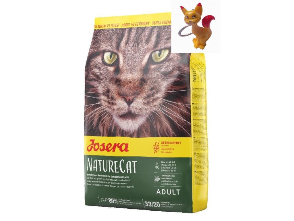 Krmivo Josera Nature Cat neobsahuje žádné obiloviny a je proto vhodné i pro nutričně citlivé kočky a koťata od 6. měsíců věku. Extra porce drůbežího masa (29%) a maso z lososa (10%) dodají organismu dostatečné množství kvalitních bílkovin. Výjimečnou chuť dodají krmivu vybrané bylinky, ovoce a zelenina. Zajistí nejen vítanou změnu v kočičím jídelníčku, ale také přísun důležitých živin. Kromě máty peprné a petrželky obohacují recepturu také arónie, borůvky, šípek a další rostlinné výtažky. Optimální poměr vápníku a fosforu a snížený obsah magnézia napomáhají regulaci pH hodnoty moči (6,0 – 6,5). Tím krmivo napomáhá redukovat tvorbu močových kamenů, což je u koček častý zdravotní problém. Křupavé granule navíc obsahují vlákninu, která napomáhá vylučování smotků chlupů. Krmivo Josera Nature Cat je obohaceno o celou řadu vitamínů, minerálních látek a stopových prvků, které přispívají ke správné funkci orgánů a podporují dobrou kondici organismu. Taurin, což je látka pro kočky zcela nezbytná, posiluje srdeční sval a zrak. Kompletní přírodní krmivo bez umělých přísad prémiové německé značky Josera, jejímž prvořadým cílem je vysoká kvalita nabízených krmiv.Krmivo Josera Nature Cat v krátkém přehledu: - kvalitní suché krmivo pro nutričně citlivé kočky a koťata od 6. měsíců věku - 100% bez obilovin: vhodné i pro alergické a nutričně citlivé jedince - vysoký obsah drůbežího masa (29%) a masa z lososa (10%): zdroje kvalitních živočišných bílkovin - obměna jídelníčku: složení obohacené o blahodárné bylinky, ovoce, zeleninu, např. máta peprná,arónie, maliny, šípek a měsíček - reguluje pH hodnotu moči (optimální hodnota je 6,0 – 6,5): optimální poměr vápníku a fosforu a snížené množství magnézia snižuje tvorbu močových kamenů - snížená tvorba bezoárů: dietetická vláknina napomáhá vylučování smotků chlupů z trávicího traktu - s taurinem: posiluje srdce a zrak - kombinace životně důležitých látek: celá řada vitamínů, minerálů a stopových prvků - bez umělých přísad - vyrobeno v Německu výrobky značky Josera podléhají přísné kontrole kvality Složení: sušený drůbeží protein 30,0%, drůbeží tuk, sladké brambory (batáty), sušené brambory, sušený losos 10%, hrachová moučka, řepné řízky, hydrolyzovaná drůbeží protein, minerální látky kvasnice, prášek z cikorky (inulin), byliny a ovoce. Analytické složky: hrubý protein 33,0%, hrubý tuk 20,0%, hrubá vláknina 2,0%, hrubý popel 6,8%, vápník 1,30%, fosfor 1,0%, hořčík 0,09%. Doplňkové látky / Nutriční doplňkové látky v 1kg: vitamín A 24.000m.j., vitamín D3 1.800 m.j., vitamín E 220mg, vitamín B1 15mg, vitamín B2 20mg, vitamín B6 20mg, vitamín B12 100mcg, kyselina panthothenová 50mg, Niacinamid 90mg, kyselina listová 5mg, biotin 1000mcg, taurin 1500mg, železo (železitan (II) sulfát, monohydrát) 175mg, zinek 150mg (chelát zinku a glycinu, hydrát), mangan 15mg (mangan-(II)-oxid,hydrát),měď 15mg (chelát mědi a glycinu, hydrát), jód 1,90mg (jodičnan vápenatý), Datum minimální trvandlivosti, hmotnost a tabulka dávkování jsou uvedeny na originálním obalu. Distributor: CZ 800518-01 Canis Prosper s.r.o.,Opavská 26, 747 19 Bohuslavice, tel.553 659 245-7, www.canis-prosper.cz. Výrobce: Josera GmbH und Co.KG, Industriegebiet, 639 24 Kleinheubach Metabolizovatelná energie 4.037 kcalDbejte na dostatek čerstvé, pitné vody. Díky uzavíratelnému obalu zůstává krmivo čerstvé a zachovává si svoje aroma. Doporučené dávkování:Josera Nature Cat je kompletní krmivo pro dospělé kočky. Váha kočky Množství v g/den 2-3 kg 25-35 g 3-4 kg 35-55 g 4-5 kg 55-70 g 5-7 kg 70-95 g 7-10 kg 95-120 gDoplňkové parametry