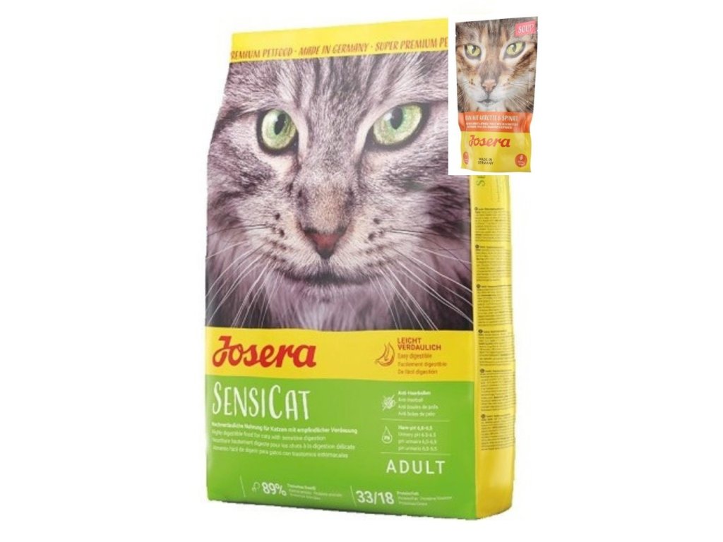 Josera Sensi Cat je šetrné a chutné krmivo s drůbežím a rýží. Především pro kočky citlivé na krmivo je tato receptura jako stvořená. Majitelé koček mohou svým miláčkům dopřát zpestření na jejich jídelníčku. Protože krmivo neobsahuje ryby, které mají velmi intenzivní chuť, může kuřecí chuť vyniknout. Josera Sensi Cat je krmivo vhodné pro kočky, které nemají rády ryby a naopak vyhledávají opravdovou pochoutku! Kompletní krmivo Josera Sensi Cat je přizpůsobeno potřebám dospělých citlivých koček. Díky použití nejkvalitnějších surovin, cenných antioxidantů a díky šetrné výrobě je krmivo lehce stravitelné. Krmivo Josera SensiCat v přehledu: - kvalitní krmivo pro dospělé kočky s citlivým trávením- proti chlupovým bezoárům: Vaše kočka tráví velkou část dne péčí o svůj kožíšek. Přitom spolyká často chlupy, z kterých se mohou vyvinout nepříjemné chlupové bezoáry. Speciální dietní vláknina podporuje pohyb spolknutých chlupů trávicím traktem a redukuje tak tvorbu chlupových bezoárů- trávení: díky surovinám v prémiové kvalitě a šetrnému zpracování surovin zaručuje Josera SensiCat vysokou stravitelnost a nabízí tak optimální krmivo kočkám s citlivým trávením.- kontrola pH: pečlivý výběr surovin zajišťuje optimální poměr vápníku a fosforu a nižší obsah hořčíku. Tím je docíleno optimálního pH v močových cestách a předchází se vzniku močových kamenů- drůbež: jako jediný zdroj bílkovin - bez přídavku ryb: krmivo Josera SensiCat je vhodné také pro vybíravé kočky - především pro ty, které nemají rády rybyKrmivo Josera je vyráběno v souladu s nejnovějšími vědeckými poznatky ve spolupráci s odborníky a odbornicemi. Produkty Josera jsou optimálně nastaveny dle individuálních potřeb Vaší kočky. Složení: sušený drůbeží protein, celozrnná kukuřice, rýže, zpracované živočišné proteiny, celulóza, řepné řízky, drůbeží tuk, hydrolyzovaný drůbeží protein, minerální látky, sušená drůbeží játra, byliny, ovoce. Deklarované jakostní znaky: hrubý protein 33,0%, hrubý tuk 18,0%, hrubá vláknina 2,0%, hrubý popel 6,7%, vápník 1,30%, fosfor 1,00%, hořčík 0,09% Dodatkové látky: Nutriční látky: vitamín A (24.000 IE/kg), vitamín D3 (1.800 IE/kg), vitamín E (220 mg/kg), vitamín B1 (15 mg/kg), vitamín B2 (20 mg/kg), vitamín B6 (20 mg/kg), vitamín B12 (100 mcg/kg), niacin (90 mg/kg), kyselina pantotenová (50 mg/kg), kyselina listová (5 mg/kg), biotin (1.000 mcg/kg), taurin (1.500 mg/kg), železo [Monohydrát síranu železnatého] (170 mg/kg), zinek [chelát zinku hydrát glycinu] (150 mg/kg), mangan [oxid manganatý] (15 mg/kg), měď [chelát mědi hydrát glycinu] (18 mg/kg), jód [Jodičnan vápenatý] (1,8 mg/kg), selen [seleničitan sodný] (0,23 mg/kg). Dbejte na dostatek čerstvé, pitné vody. Metabolizovatelná energie 3986.0 kcal Zip na obalu garantuje zachování aroma a zaručuje denně čerstvý požitek ZDARMA Josera Soup 70g Huhn mit Karotte&Spinat kaps.Vhodné na polití suchých granulí nebo pro kočky, které nechtějí přijímat tekutiny ve formě vody. Polévka je zcela bez obilovin a obsahuje kuře, mrkev a špenát. Tuto pochoutku si zamiluje i ten největší kočičí labužník! Vyrobeno v Německu.Složení: kuřecí vývar, kuře (maso a játra) 20,0 %, mrkev 2,5 %, špenát 0,50 %.Deklarované jakostní znaky: hrubý protein 4,7 %, hrubý tuk 1,5 %, hrubá vláknina 0,3 %, hrubý popel 1,5 %, vlhkost 90,0 %. Doporučené dávkování:Josera Sensicat je kompletní krmivo pro kočky. Váha denní dávka v g 2 - 3 kg 25 - 40 3 - 4 kg 40 - 55 4 - 5 kg 55 - 70 5 - 7 kg 70 - 95 7 - 10 kg 95 - 120Doplňkové parametry