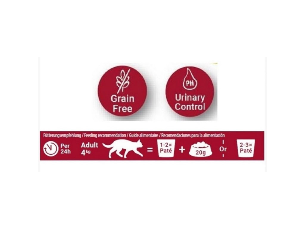 Krmivo pro kočky je tvořeno delikatesními kousky a vyznačuje se vysokým podílem masa. Vyvážená receptura a optimální pH přispívá k tomu, aby se v moči netvořili kameny. Navíc neobsahuje obiloviny, proto je správnou volbou i pro kočky trpící alergiemi nebo potravinovými intolerancemi. Krmivo bylo vyrobeno v Německu a můžete jej kočce podávat každý den. Složení s kuřecím masem a lososem: kuřecí plátek 40%, kuřecí vývar 39,0%, losos 10,0%, kuřecí játra, kuřecí tuk, minerály.Deklarované jakostní znaky: hrubé proteiny 11,8%, hrubý tuk 5,7%, hrubá vláknina 0,4%, hrubý popel 2,2%, vlhkost 79,0%.Nutriční doplňkové látky v 1kg: 20mg Vitamín E, 1500mg Taurin, 25mg Zinek (síran zinečnatý, Monohydrát), 1,40mg Mangan (síran manganatý, Monohydrát), 1,00mg Měď (síran měďnatý, Monohydrát), 0,75mg Jód (Jodičnan vápenatý).Doplňkové parametry