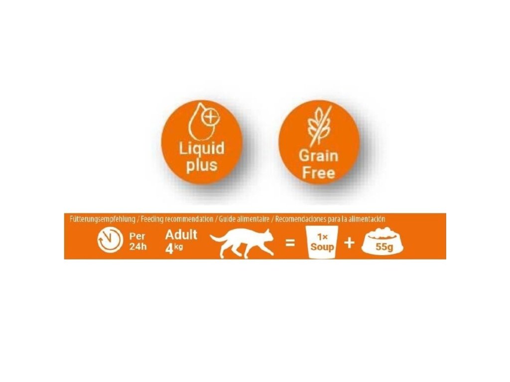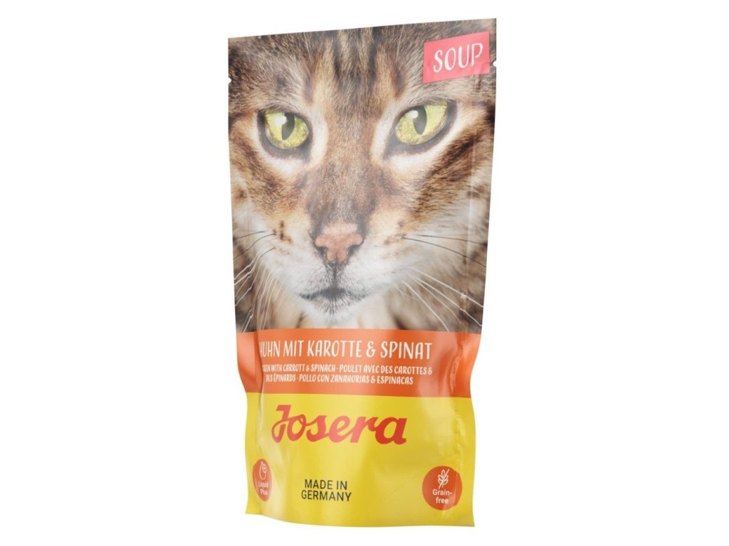 Vhodné na polití suchých granulí nebo pro kočky, které nechtějí přijímat tekutiny ve formě vody. Polévka je zcela bez obilovin a obsahuje kuře, mrkev a špenát. Tuto pochoutku si zamiluje i ten největší kočičí labužník! Vyrobeno v Německu.Složení: kuřecí vývar, kuře (maso a játra) 20,0 %, mrkev 2,5 %, špenát 0,50 %.Deklarované jakostní znaky: hrubý protein 4,7 %, hrubý tuk 1,5 %, hrubá vláknina 0,3 %, hrubý popel 1,5 %, vlhkost 90,0 %. Rodinná firma Josera se sídlem v Bavorsku a dlouholetými zkušenostmi ve výživě zvířat je německým specialistou na prvotřídní krmiva pro psy a kočky. Její důraz na zdraví zvířat, mimořádnou chutnost krmiv a jejich výbornou stravitelnost je znám zákazníkům ve více než 70 zemích světa. V jedné oblasti je ale světovým lídrem a ukazuje správnou cestu i dalším firmám. Tou oblastí je udržitelnost a celkový odpovědný přístup k naší budoucnosti – budoucnosti lidí, zvířat a přírody. Potvrzením toho přístupu je fakt, že od roku 2020 je firma Josera 100% CO2 neutrální. Její heslo zní – „Udržitelnost nikdy nechutnala lépe!“Doplňkové parametry