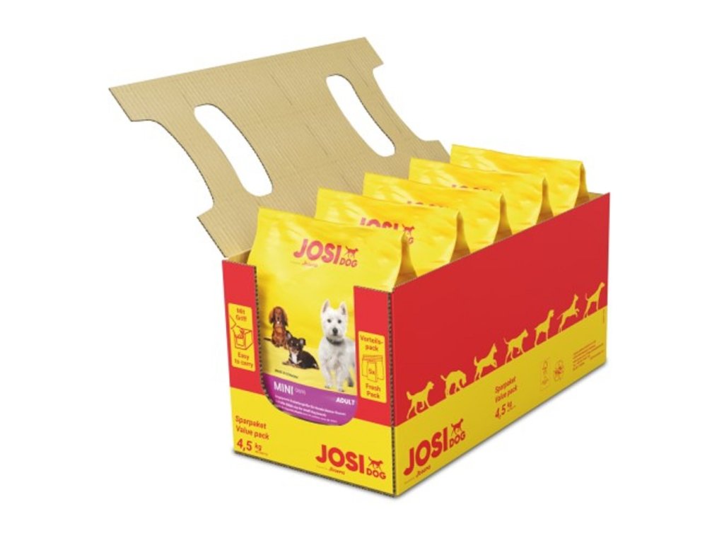 Krmivo s vhodnou velikostí granulí pro mimi a malá plemena psů. JosiDog Mini v krátkém přehledu:- 78 % živočišných proteinů a 22 % rostlinných bílkovin- bezlepková receptura- vysoký obsah antioxidantů pomáhá chránit buňky před volnými radikály- taurin podporuje kardiovaskulární systém, zrak a plodnost- prebiotický inulin posiluje střevní flóru- glykosaminoglykany (GAG) se přirozeně nacházejí v kloubní chrupavce psa- bez geneticky modifikovaných surovin, barviv, dochucovadel a konzervantů Složení: celozrnná kukuřice, sušený drůbeží protein, rýže, řepné řízky, drůbeží tuk, sušený kachní protein, hydrolyzovaný drůbeží protein, minerální látky, kvasnice, sušený kořen čekanky(přirozený zdroj inulinu), sušené maso novozélandských pyskatých zelených mušlí (Perna canaliculus). Analytické složky: bílkoviny 26 %, tuky 11 %, vláknina 2,5 %, popel 6,7 %, vápník 1,5 %, fosfor 1 %, sodík 0,4 %, Taurin 1.000mg. Doplňkové látky v 1 kg: vitamín A 24 000 m. j./kg, vitamin D3 1800 m. j./kg, vitamin E 220 mg/kg, biotin 800 mcg/kg, železo (síran železnatý, monohydrát) 200 mg/kg, zinek (chelát zinku a glycinu, hydrát) 160 mg/kg, mangan (Mangan-(II)-oxid) 16 mg/kg, měď (chelát mědi a glycinu, hydrát) 20 mg/kg, jód (jodičnan vápenatý) 2,0 mg/kg, selen (seleničitan sodný) 0,25 mg/kg.Metabolická energie 3 608 kcal/kgTechnologické doplňkové látky: Antioxidanty: tokoferolový extrakt přirozeného původu. Dbejte vždy na dostatek črstvé pitné vody. Doporučená dávkovací tabulka - denní dávka v gramech Váha psa 2kg 4kg 6kg 8kg 10kg 50-70g 80 - 110g 90-130g 100-140g 120-180g Dbejte na dostatek čerstvé, pitné vody.Doplňkové parametry