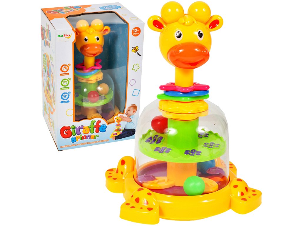 Po stisknutí hlavy žirafy se kolo uvnitř otočí a kuličky lehce poskakují.