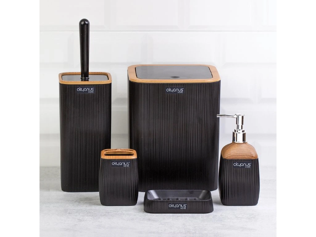 Černá pětikomponentní koupelnová sada čtvercového tvaru s dřevěnými doplňky, vyrobena z plastu. Sada obsahuje: - koš na odpadky 19x22,3 cm - toaletní kartáč: 10,2x34,2 cm - dávkovač mýdla 7,5x18,2 cm - kelímek na kartáček 7,5x10 cm - mýdlenka 13,1x9,1x2,5 cmDoplňkové parametry