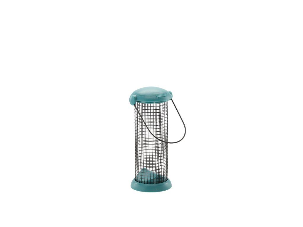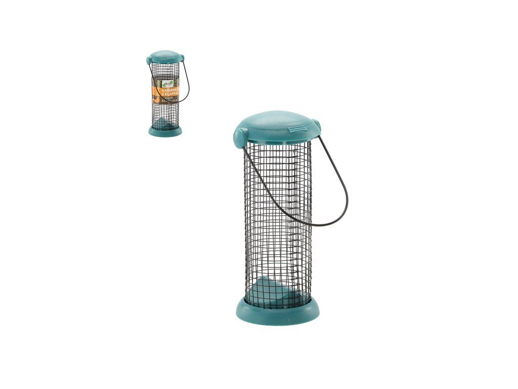 Praktické krmítko ve tvaru tuby, určené na zrní a oříšky, vybavené prvkem pro zavěšení a pohodlnou klapkou usnadňující doplňování. Vyrobeno z kovu a materiálu PC, ideální pro přikrmování ptáků po celý rok.