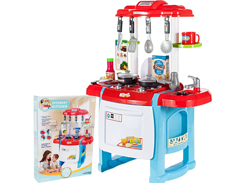 Kuchyňka pro děti s doplňky a troubou. 19 DOPLŇKŮ. Má 2 hořáky, které svítí červeně, vydávají zvuky pečení a vaření. Baterie: 3xAA nejsou součástí balení.